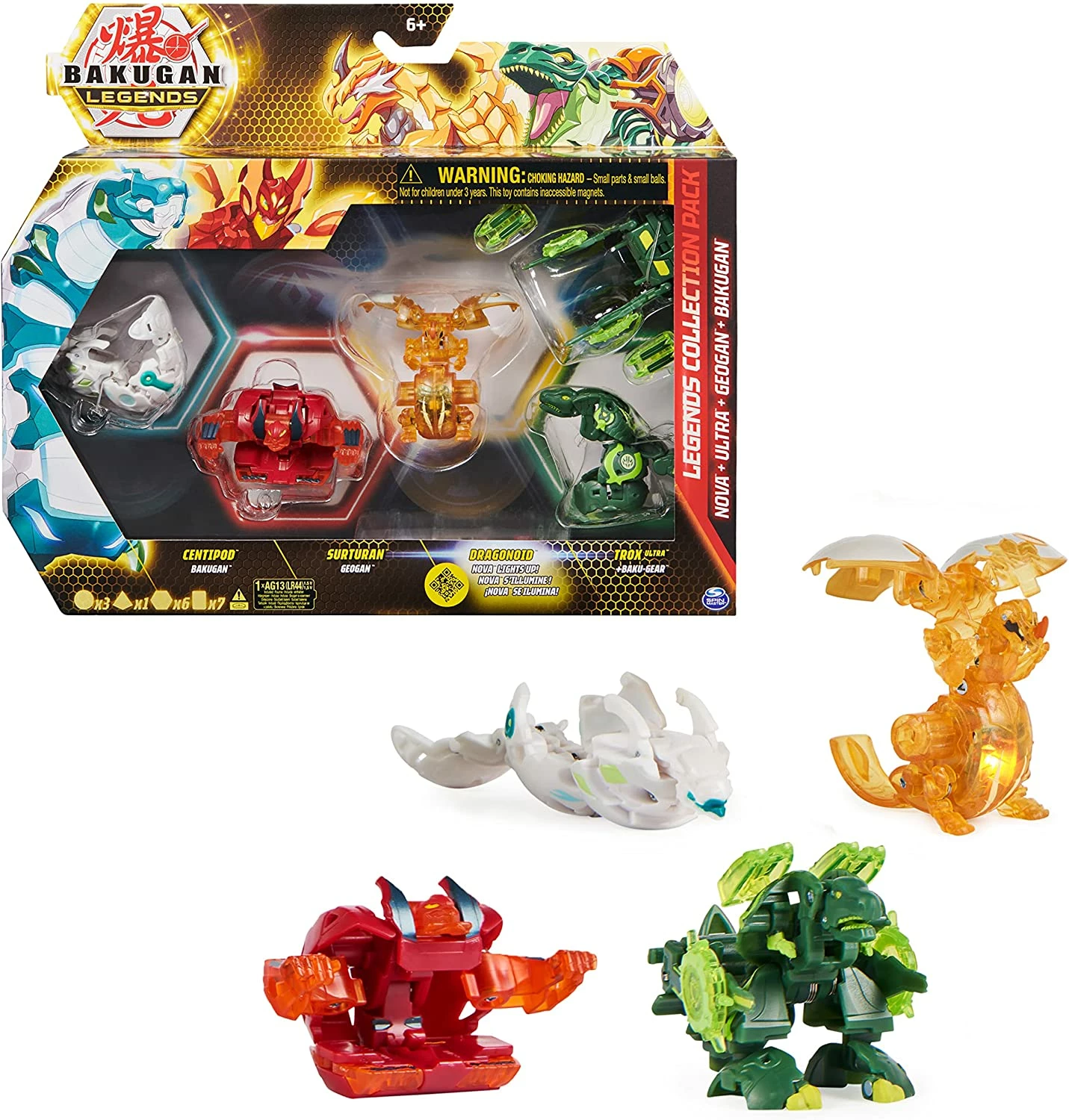 Includes: 1 Nova Bakugan, 1 Ultra Bakugan, 1 Baku-Gear, 1 Geogan, 1 Bakugan, 6 BakuCore, 3 Character Card, 2 Ability Cards, 2 Gate Cards, 1 Instruction Sheet.