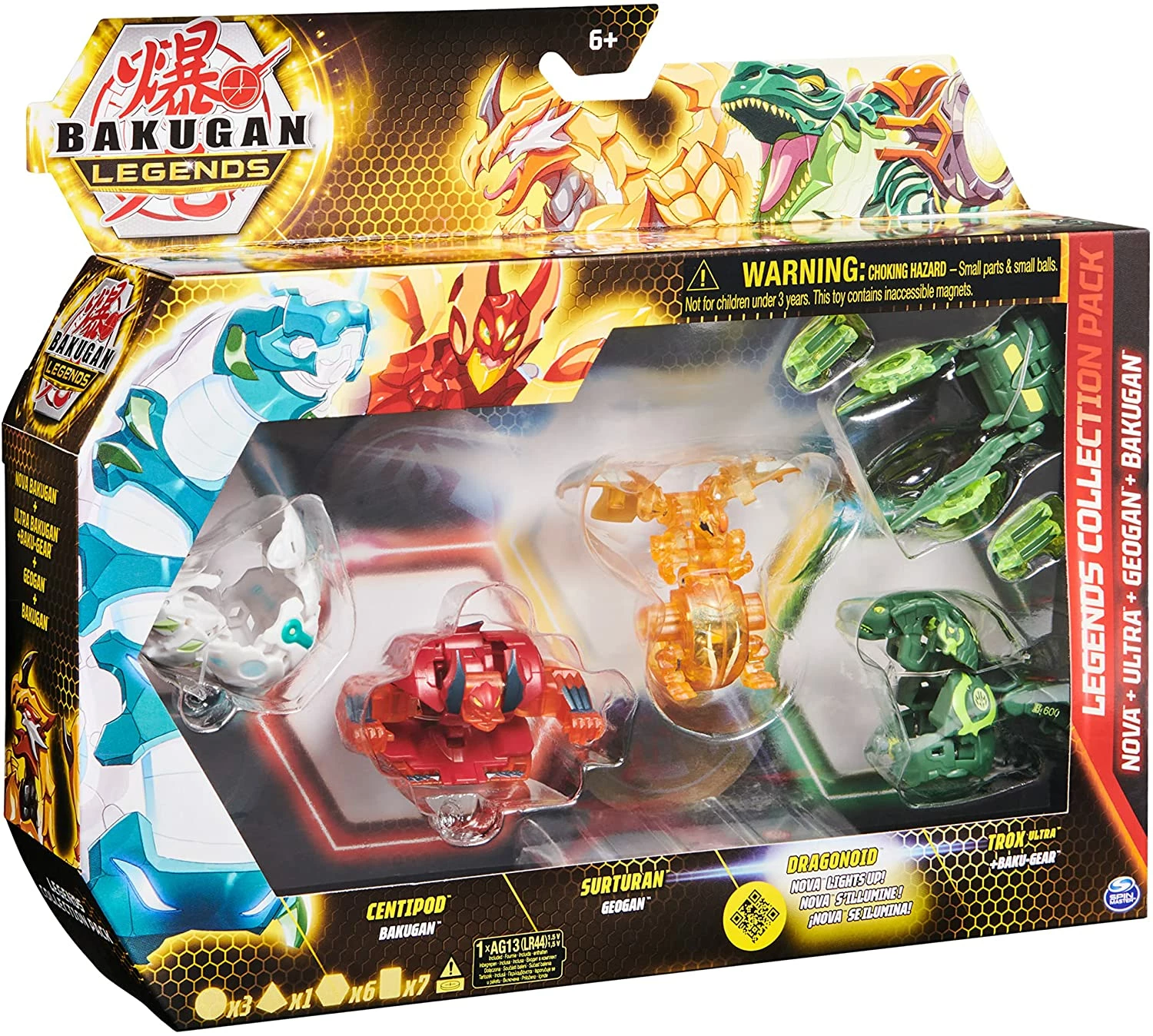 The Bakugan Legends Collection Pack has everything you need to brawl right out of the box! It features 4 Bakugan, collectible character and ability cards and Gate Cards and more! Your Bakugan toy collection just became stronger than ever with the Nova Bakugan that light up! See the light show as you roll them over the BakuCores (6 included)! Watch your Bakugan pop-open and transform into a fierce action figure creature.