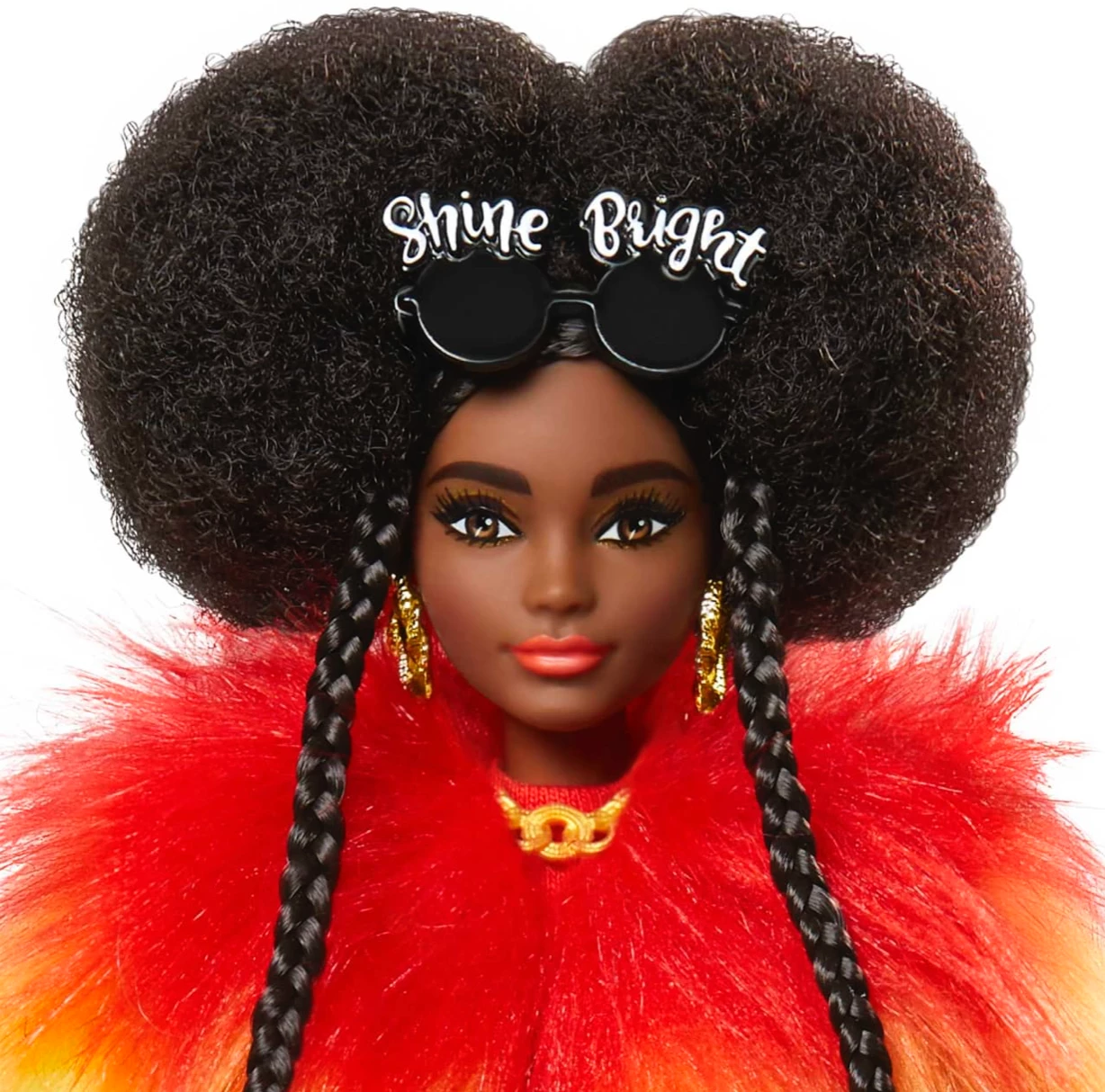 - Barbie doll’s hairstyle goes big with brunette afro-puffs styled with 2 long braids.