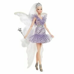 A visit from the tooth fairy is a magical milestone. This collectible Barbie® doll commemorates the sweet moment with a fantastical look and accessories. Barbie® Tooth Fairy doll wears a pretty, periwinkle dress featuring fluttery ruffles, sparkling polka dots and a beaded belt. Her look is complete with shimmery fairy wings, a silvery wand and a gemstone-encrusted tiara in her whimsical white hair. With a shimmering bag of silvery coins and packaging featuring space to write a personalized message, Barbie® Tooth Fairy doll makes the perfect gift to celebrate such a special day. Includes doll stand and Certificate of Authenticity. Doll cannot stand alone. Colors and decorations may vary.