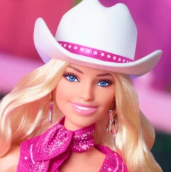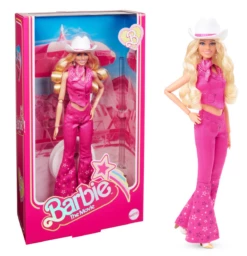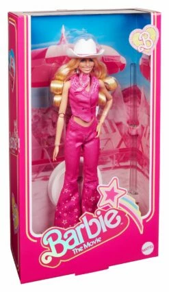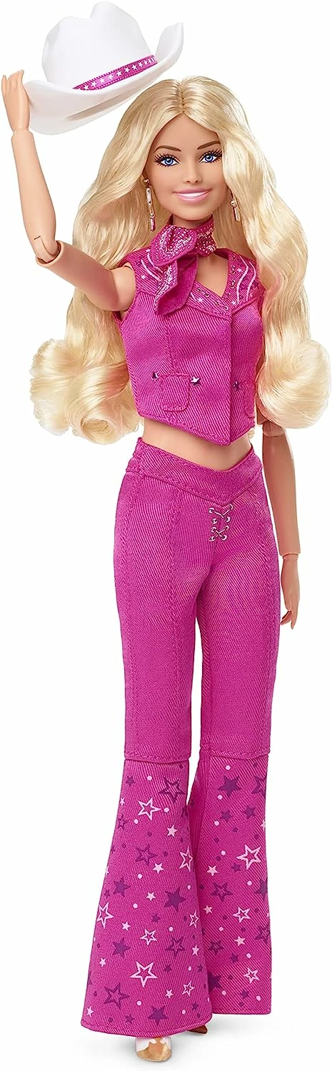 Greetings from Barbie Land! This collectible Barbie® doll turns heads in her all-pink look modeled after Barbie’s western outfit in Barbieâ„¢ The Movie. She wears a matching denim vest and flare jeans with a cowboy hat and boots. In the likeness of Margot Robbie as Barbie, she makes a great gift for fans and collectors alike! Doll stand included. Doll cannot stand alone. Colors and decorations may vary.