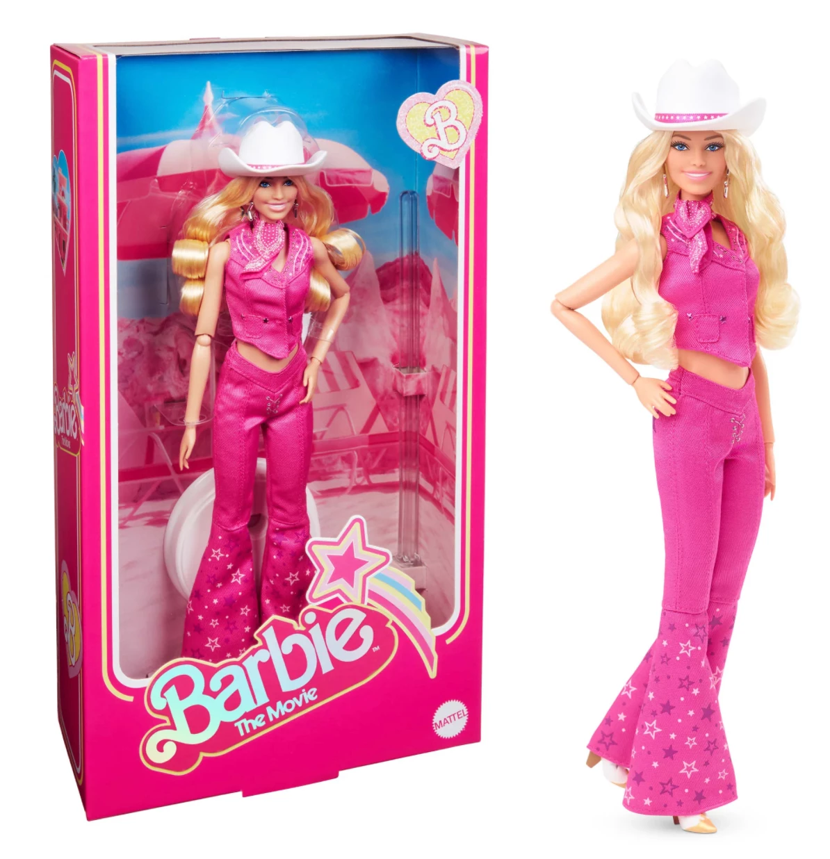 - ​Barbie® celebrates Barbie™ The Movie with a collector doll in an eye-catching western outfit that features a matching vest and V-waist flare jeans.