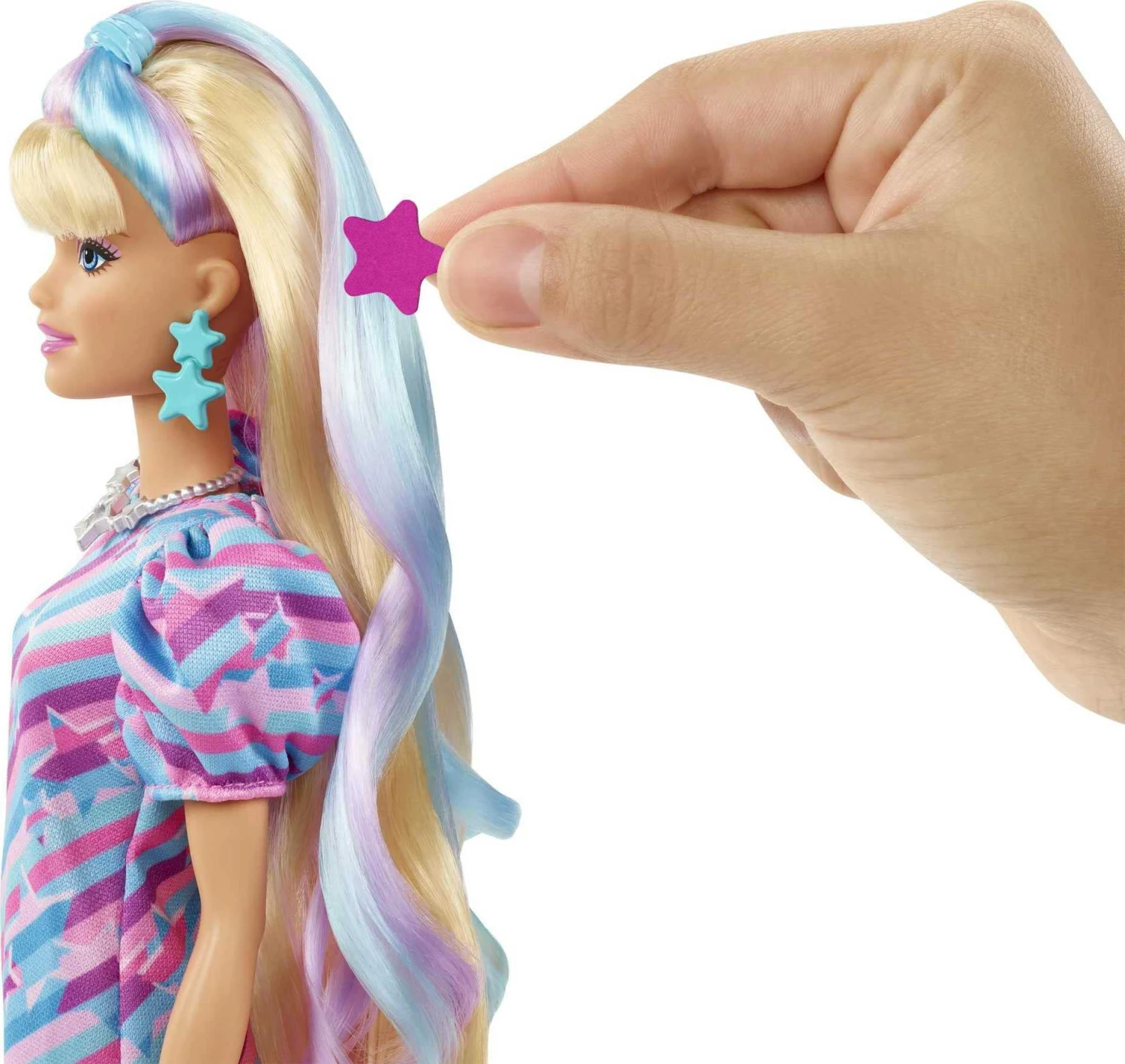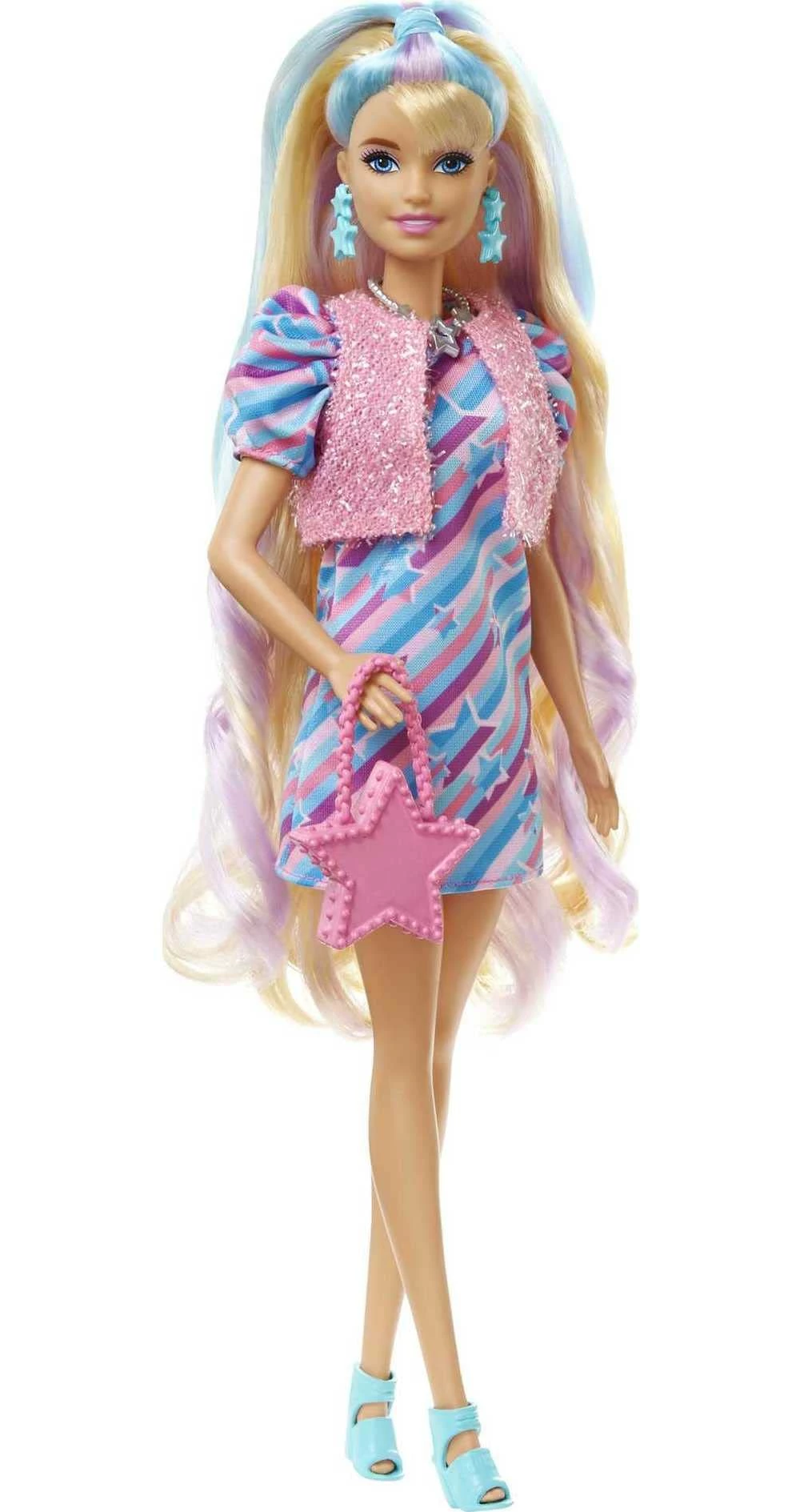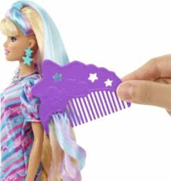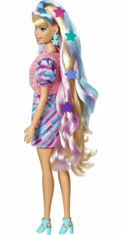 Featuring an original body shape, the star-themed doll comes with side-swept bangs as a nod to the original Barbie Totally Hair doll plus has beautiful purple and blue highlights.