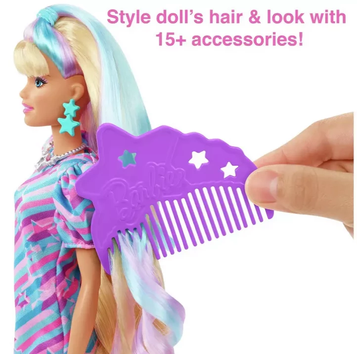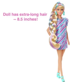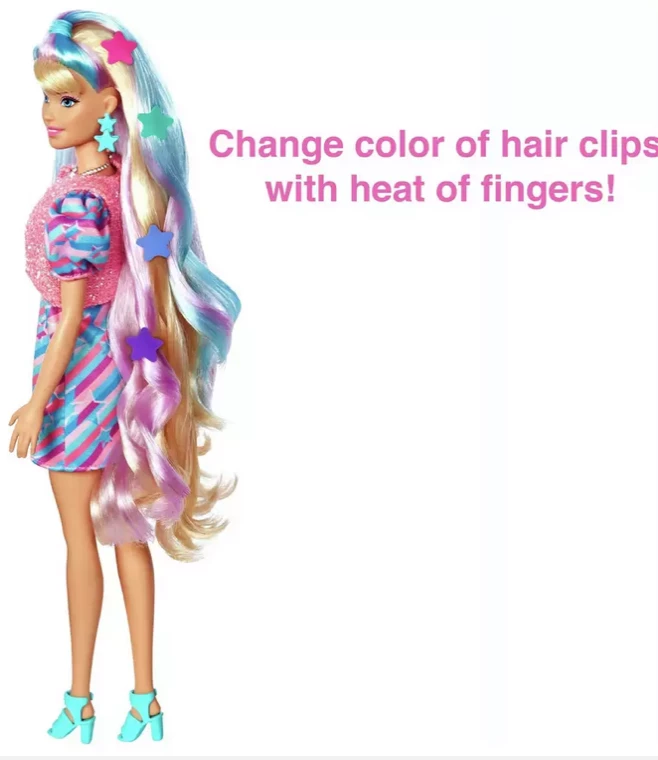 Barbie doll has 8.5 inches of extra-long playable hair and comes with 15+ additional pieces: 8 are colour change hair clips, a comb, 1 set of hair ties, 2 scrunchies, metallic vest fashion, purse, sunglasses and a necklace.