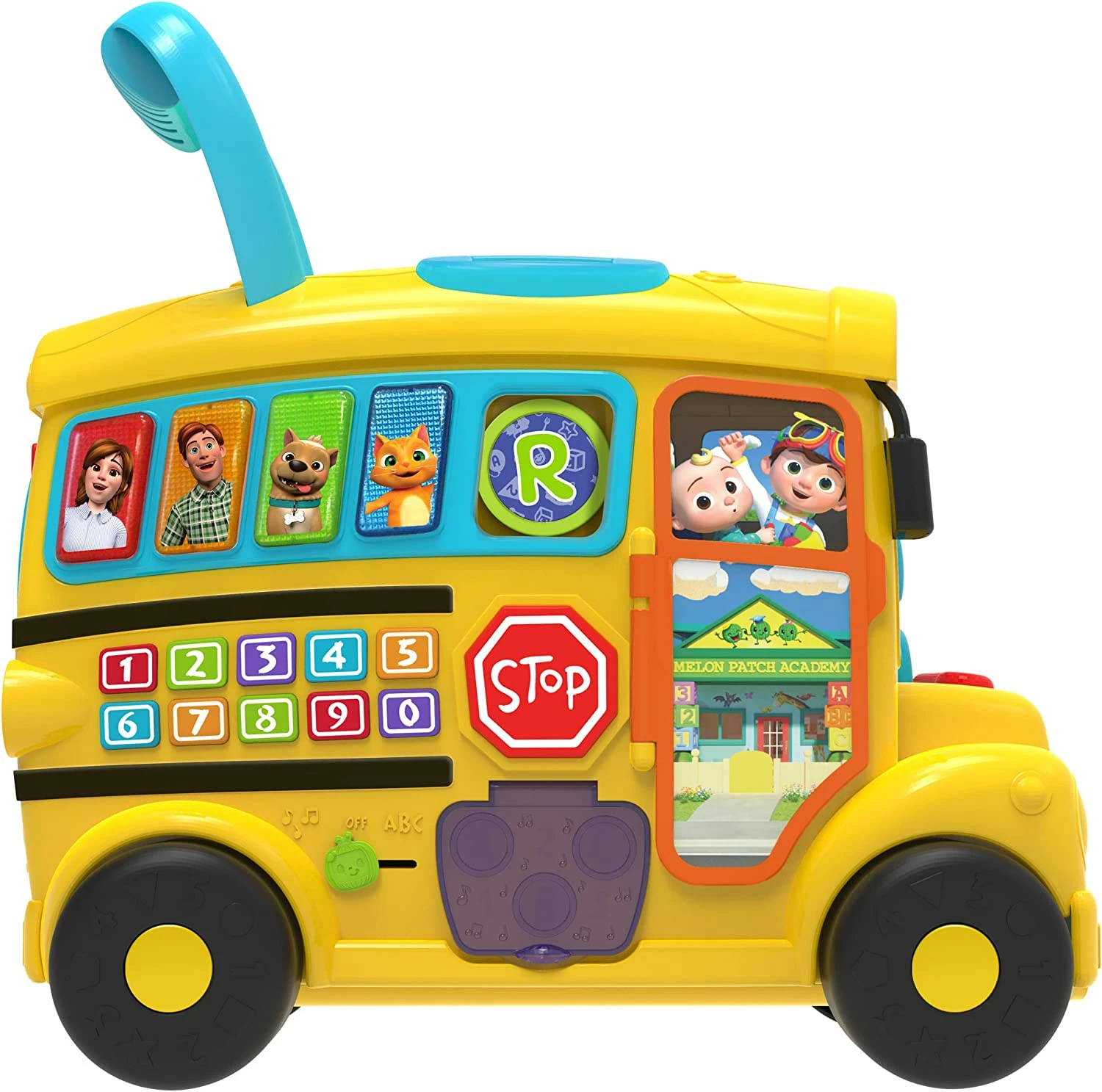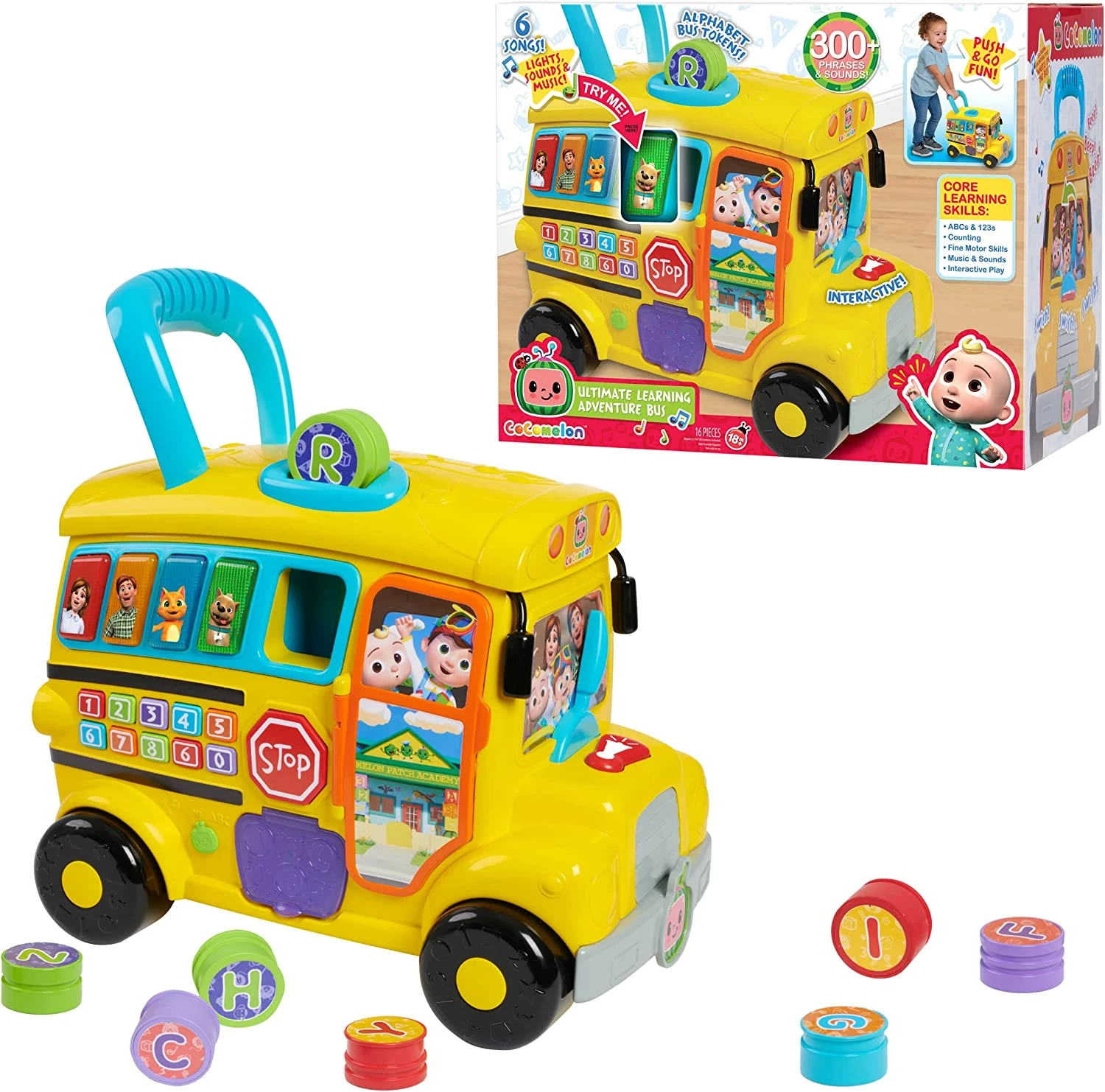 Learn and play with JJ! Get ready for hours of learning fun with the CoComelon Ultimate Adventure Learning Bus toddler toy. Inspired by the CoComelon animated series, this interactive toy bus lets toddlers engage in their own learning adventures with JJ. It features 2 modes of play: Music and Learning. In Music mode, use the buttons, wipers, horn, and door to sing along to “Wheels on the Bus.” Use the dial on the back to play four nursery rhymes: “The Alphabet Song,” “Bingo,” “Twinkle, Twinkle Little Star,” and “Head, Shoulders, Knees and Toes.” Press the keypad to hear “Ten in the Bed!” Switch to Learning mode to learn numbers and colors. Use the bus tokens to learn letters and phonics. There’s a handle on the roof, so toddlers can push the bus along. Bring home the CoComelon Ultimate Learning Bus, as well as the rest of the CoComelon learning and education toys, to help make curious toddlers happy and smart! Requires 3 x AA batteries (included). For kids ages 18 months and up.