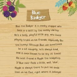 Blue the Badger is a cheeky chappie who lives in a sett by the mossy old log.