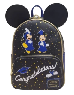 Say congratulations with this Loungefly Disney Mickey & Minnie Mouse Graduation Mini Backpack. This mini-backpack is made of faux leather with top zipper closure, adjustable shoulder straps, sturdy metal hardware, matching themed lining, zipper pull charm, and printed details. Measures approximately 12″ H x 9″ W x 4.5″ D.