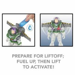 Discover Disney and Pixar’s Lightyear. Stranded on an uncharted planet, Buzz Lightyear and his crewmates will need to battle hostile plants, giant bugs and the ultimate threat, Zurg, to complete their mission and return home. This Jetpack Liftoff figure presents Buzz Lightyear in his familiar Space Ranger Alpha suit with jetpack. After the fusion cannister is filled with water and loaded in, Buzz can snap on his helmet and spread his jetpack wings to their full 9.5-inch width to prepare for liftoff. When Buzz is lifted off the ground, light and sound effects play and an actual vapor trail comes out of the jetpack for realistic flying hero play! The fun is amplified by more than 20 phrases and sounds from the thrilling animated adventure. At 11.8 inches tall, this high quality authentic toy has 12 movable joints for deluxe posability, ready to recreate more signature movie action. Colors, dimensions and decorations may vary.