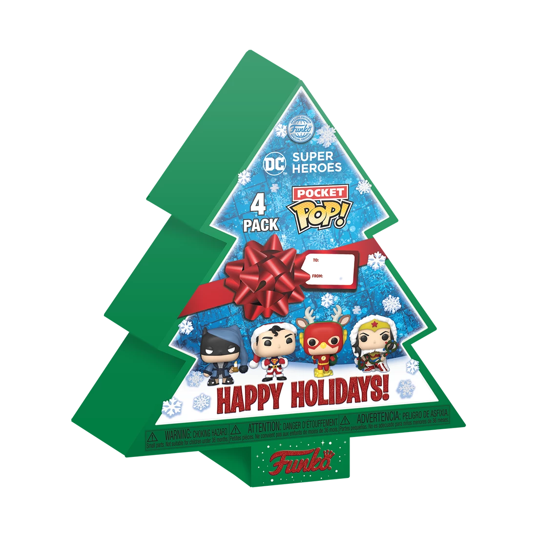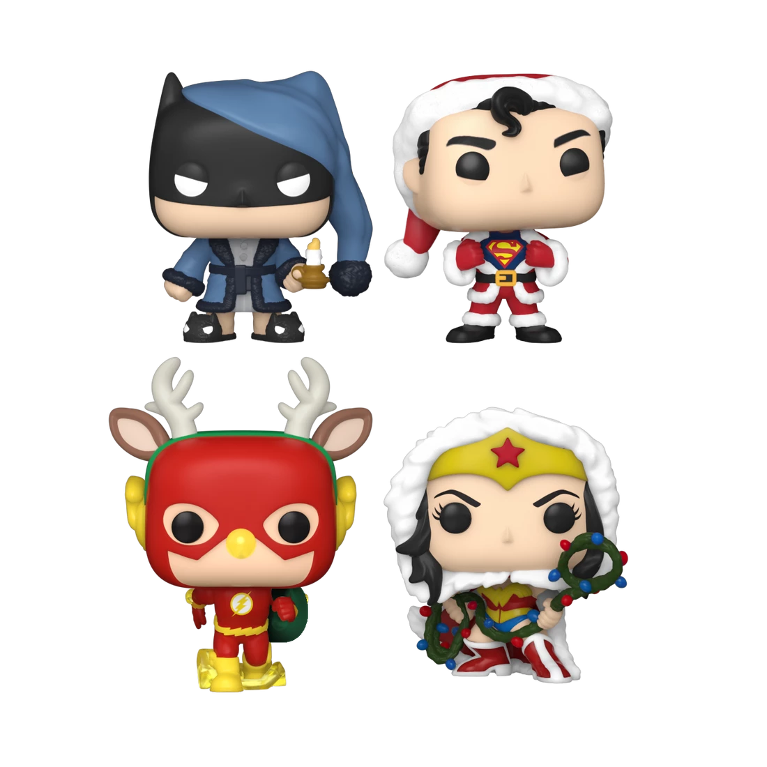 Stuff your stockings in super-hero style with the Walmart-exclusive Pocket Pop! 4-Pack of DC Heroes. Prepare to deck the halls with DC super heroes that are all decked out for the holidays. Pop! Wonder Woman and Pop! Batman wear festive Santa hats, while Pop! The Flash looks ready to speedily deliver presents, dressed as a reindeer. Pop! Batman wears his nightcap and bathrobe, and he holds a lit candle, prepared to confront any disturbances coming from the chimney of the Batcave. All four Pocket