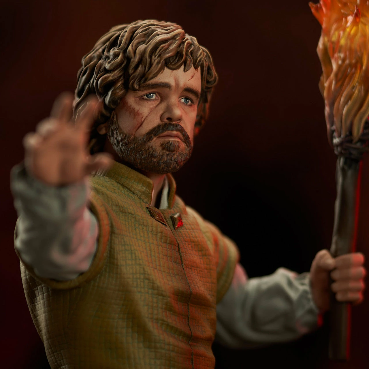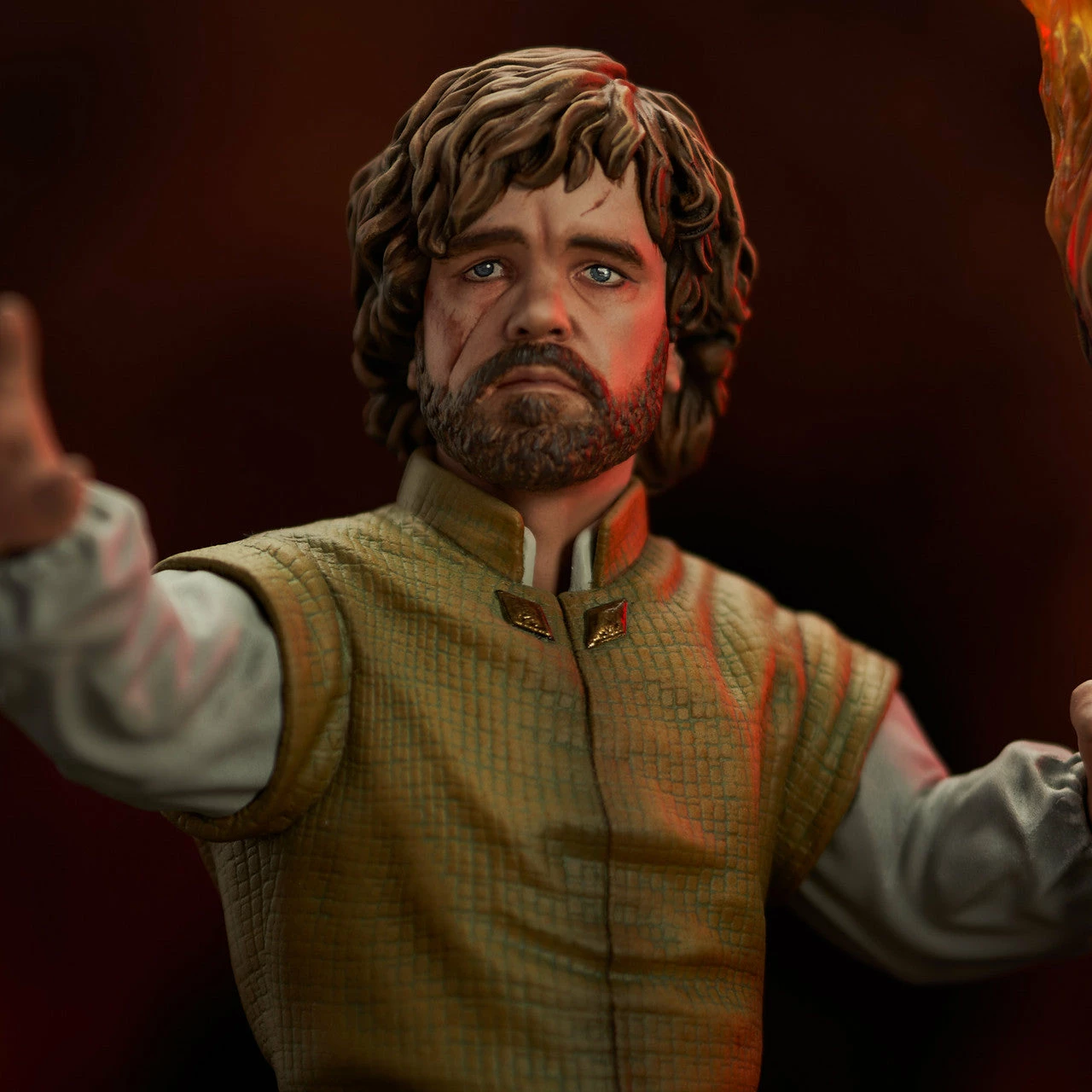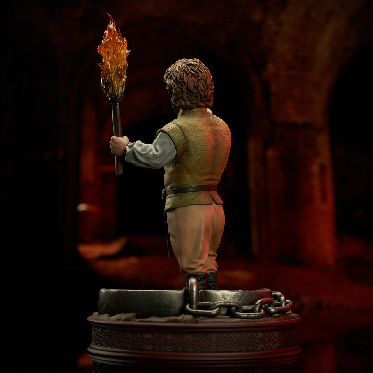 Return to the world of Game of Thrones with an all-new Gallery Diorama of Tyrion Lannister. The former Hand of the King holds a torch aloft in the dragonpit, standing near a massive dragon shackle. Measuring approximately 9″ tall, this sculpture is made of high-quality PVC and features detailed sculpting & paint applications. Designed by Nelson X. Ascencio; sculpted by Ed Trujillo.