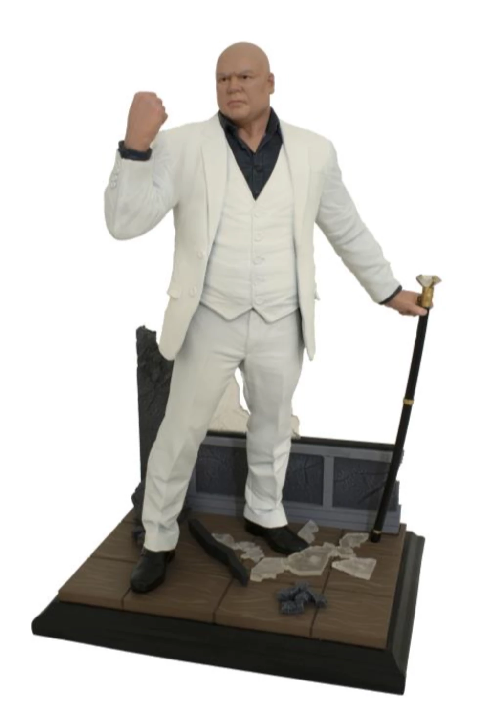 The Kingpin has arrived! This 10-inch Gallery Diorama of Vincent D’Onofrio as TV’s Kingpin is based on his appearance in the Hawkeye TV series. Wearing his white suit, black shirt and carrying his diamond-headed cane, The Kingpin stands amidst the wreckage of his fight with Kate Bishop. Measuring approximately 10 inches tall, this sculpture is made out of high-quality PVC and comes packaged in a full-color window box and was designed by Nelson X. Asencio. Â