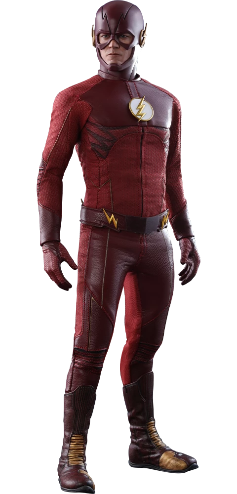 - One specially tailored burgundy-coloured Flash suit with leather-like sections