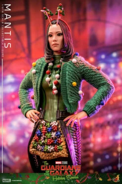 The highly-accurate Mantis collectible includes a meticulously crafted head sculpt with signature antennae, specialized physique, finely tailored outfit strictly faithful to the screen appearance, a delicately designed green holiday sweater with pompom, an array of holiday accessories such as Christmas tree headband, pompom necklace, gift bows apron, giant candy cane, sunglasses and Marvel action figure stand.