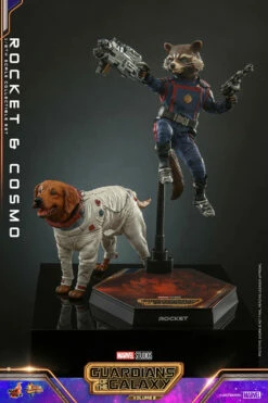 Hot Toys presents the 1/6th scale Rocket & Cosmo Figure Set as featured in Guardians of Galaxy Vol. 3. This well-crafted collectible accurately captures Rocket the talking raccoon’s look from the movie, from his finely sculpted head with fur detail to his navy-blue combat suit with emblem on chest. The set also includes an array of weapons and accessories, such as heavy blaster and pistols, key card, and dynamic figure stand for aerial poses. To round out the set, we have Cosmo the spacedog featuring hyper-realistic paintworks. Add this Marvel collectible to your collection with attitude today!