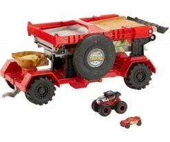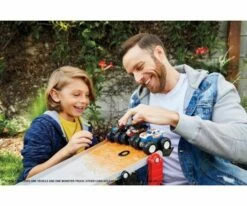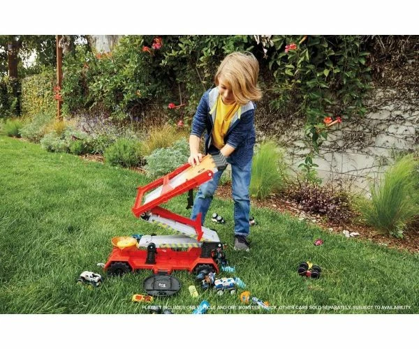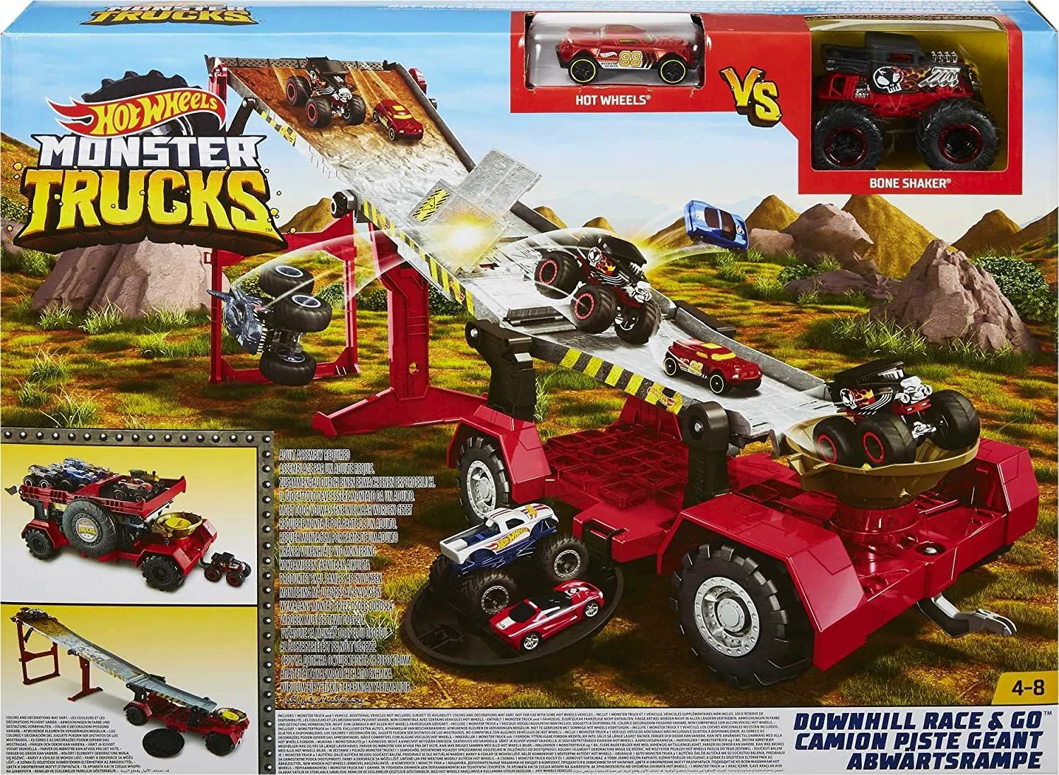 Set comes with a Hot Wheels Monster Truck and a Hot Wheels car. Big downhill racing fun for fans of Hot Wheels and Monster Trucks!