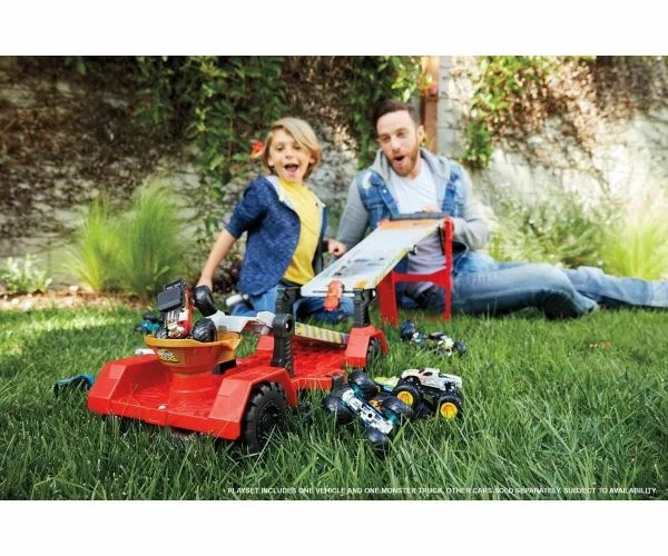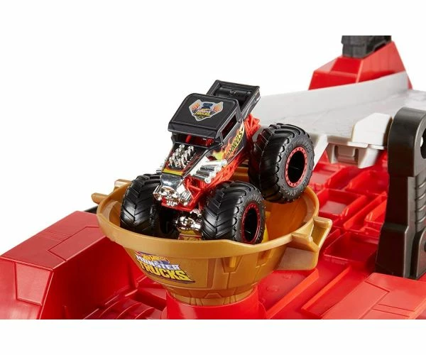 More features than any Monster Truck play set you’ve seen before! Hot Wheels Monster Truck Downhill Race & Go is the the ultimate race between Hot Wheels Monster Trucks and Hot Wheels cars. Smash and crash your way to be the first to land in the Trophy Cup! That triggers the Crash Ramp to fall and sends the other vehicles flying! Set also acts as a Monster Truck Transporter. In Transporter mode, connect a 1:64 scale Monster Truck to the front and drive away!