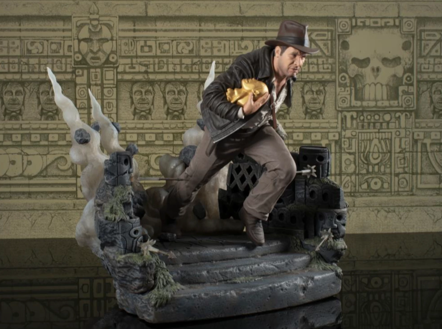 Run for your life, Indiana! Doctor Jones sprints past launching arrows, idol in hand, as a giant boulder rolls after him, destroying all in its path. Standing approximately 10 inches tall, this sculpture is made of high-quality PVC and comes packaged in a full-color window box.