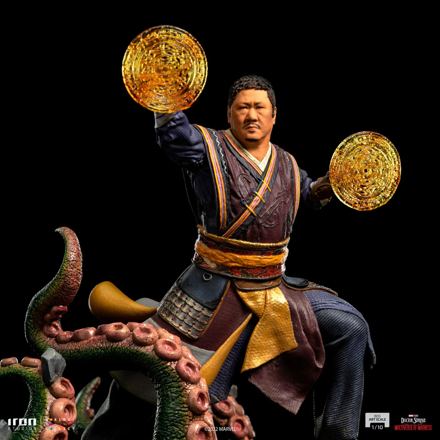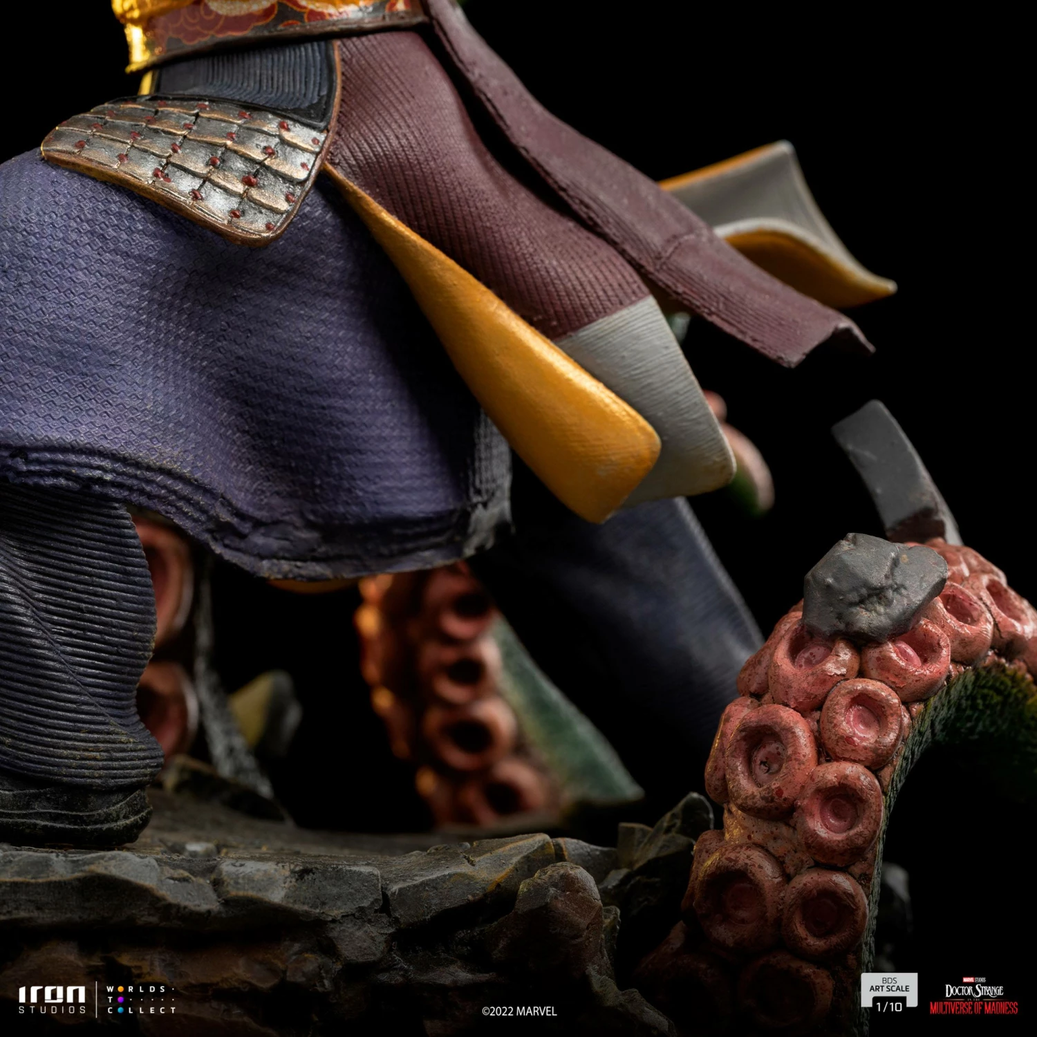 With the giant tentacles of an ancient creature breaking the base of the floor at his feet, serious and inflexible, one of the greatest masters of the mystical arts summons, with magic, energy mandalas to fight the monster. Wearing a combat kimono in blue, yellow, and purple colors with details in red, the new Sorcerer Supreme uses his mystical knowledge together with his martial skills, which makes him a powerful fighter capable of facing opponents much larger than him. One of the most charismatic heroes in the MCU gets his first statue by Iron Studios, revealed at SDCC, “Wong BDS – Doctor Strange in the Multiverse of Madness – Art Scale 1/10”, brings the monk, sorcerer, ally warrior, and best friend of Doctor Strange.
