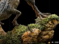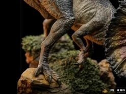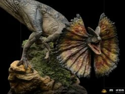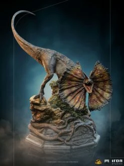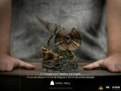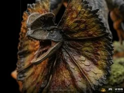 Hissing, the primitive and lethal carnivore expands and shakes his hidden fans on his neck announcing his attack, he’s about to expel his tar poison aiming for his prey’s eyes to stun them before jumping to devour them. Originally alive during the Jurassic Period before the mosquitoes were confirmed by the fossil record, and with more gaps than usual in his DNA sequence, he was recreated by InGen with the Yellow-Banded Poison Dart Frog DNA to fill the gaps in his genetic sequence, resulting in an even deadlier creature, with traits the original never had. As seen already in the trailer threatening Claire Dearing, Iron Studios bring the statue ”Dilophosaurus – Jurassic World: Dominion – Art Scale 1/10”, in a new collectible statue over a pedestal of wild terrain with the movie’s logo.