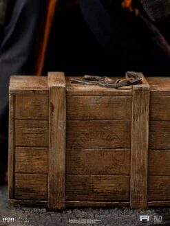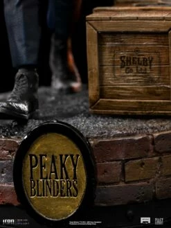 With firm steps and eyes focused on his objective, the moody gangster walks over the rustic and dirty floor of some hangar in England at the height of the Industrial Revolution, next to a crate with his family company name on it, with a horseshoe on top referencing the horse racing that is part of their business, he prepares himself to draw his gun from his leather armpit holster, hidden by his overcoat above his elegant suit from that time. With his traditional newsboy cap on his head, Iron Studios present the statue “Arthur Shelby – Peaky Blinders – Art Scale 1/10”, bringing one of the main characters from the successful British crime-drama TV series Peaky Blinders, over a pedestal surrounded by old bricks with the logo on the front.