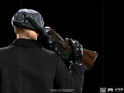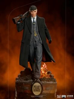 Elegantly dressed in a black overcoat over a grey suit, the fearsome figure of the gangster leader from a powerful criminal organization walks over a rustic pedestal, that refers to the dirty streets of the British city of Birmingham in the 1920s, with the floor filled with coal and flames, surrounded by old bricks and displaying the series’ logo on the front. Bringing his submachine gun on his right arm, held by his gloved hands, resting it on his shoulder, with his head covered by his characteristic grey newsboy cap, Iron Studios present the statue “Thomas Shelby – Peaky Blinders – Art Scale 1/10”, with the main protagonist from the successful British crime-drama TV series Peaky Blinders.