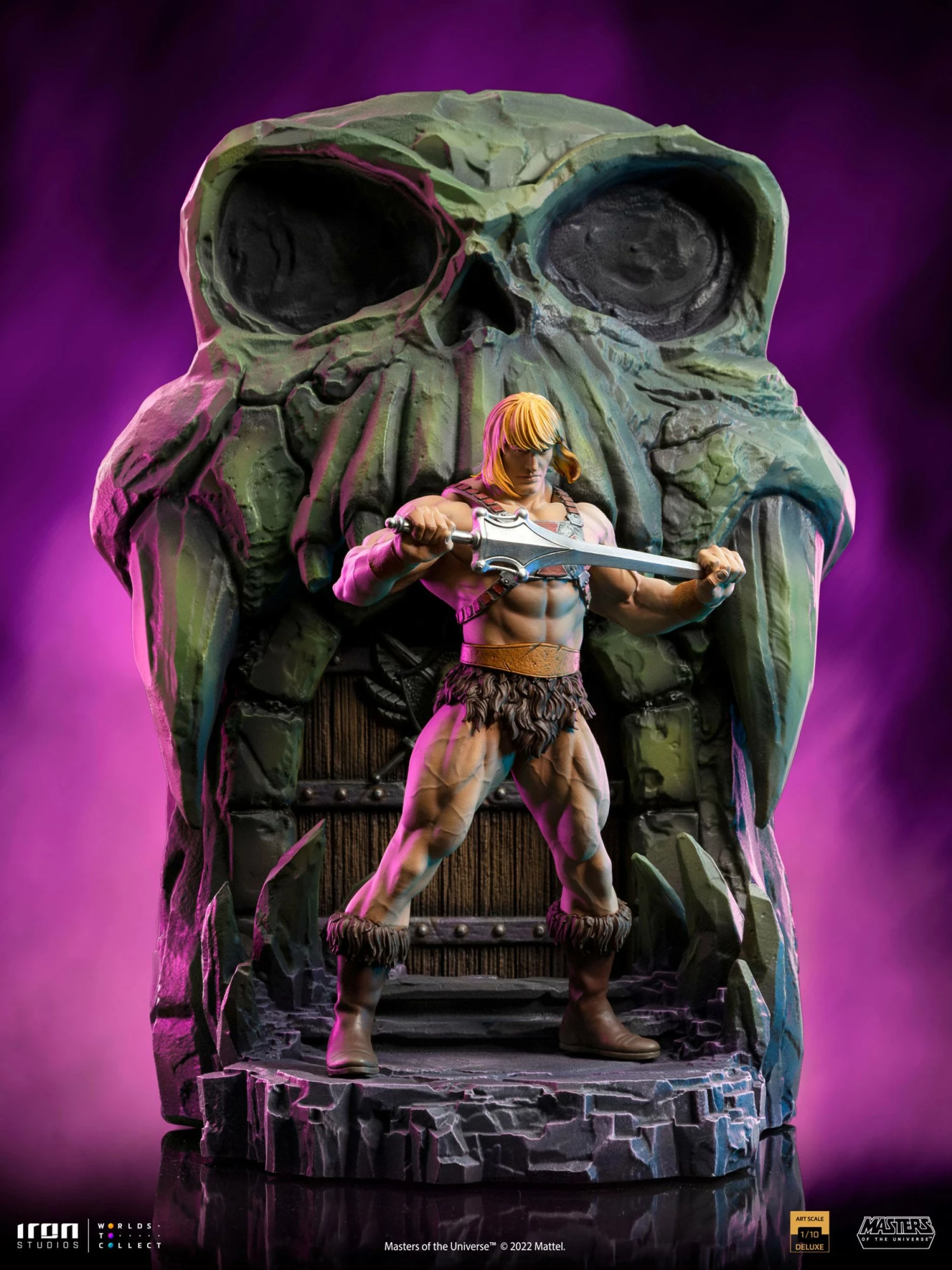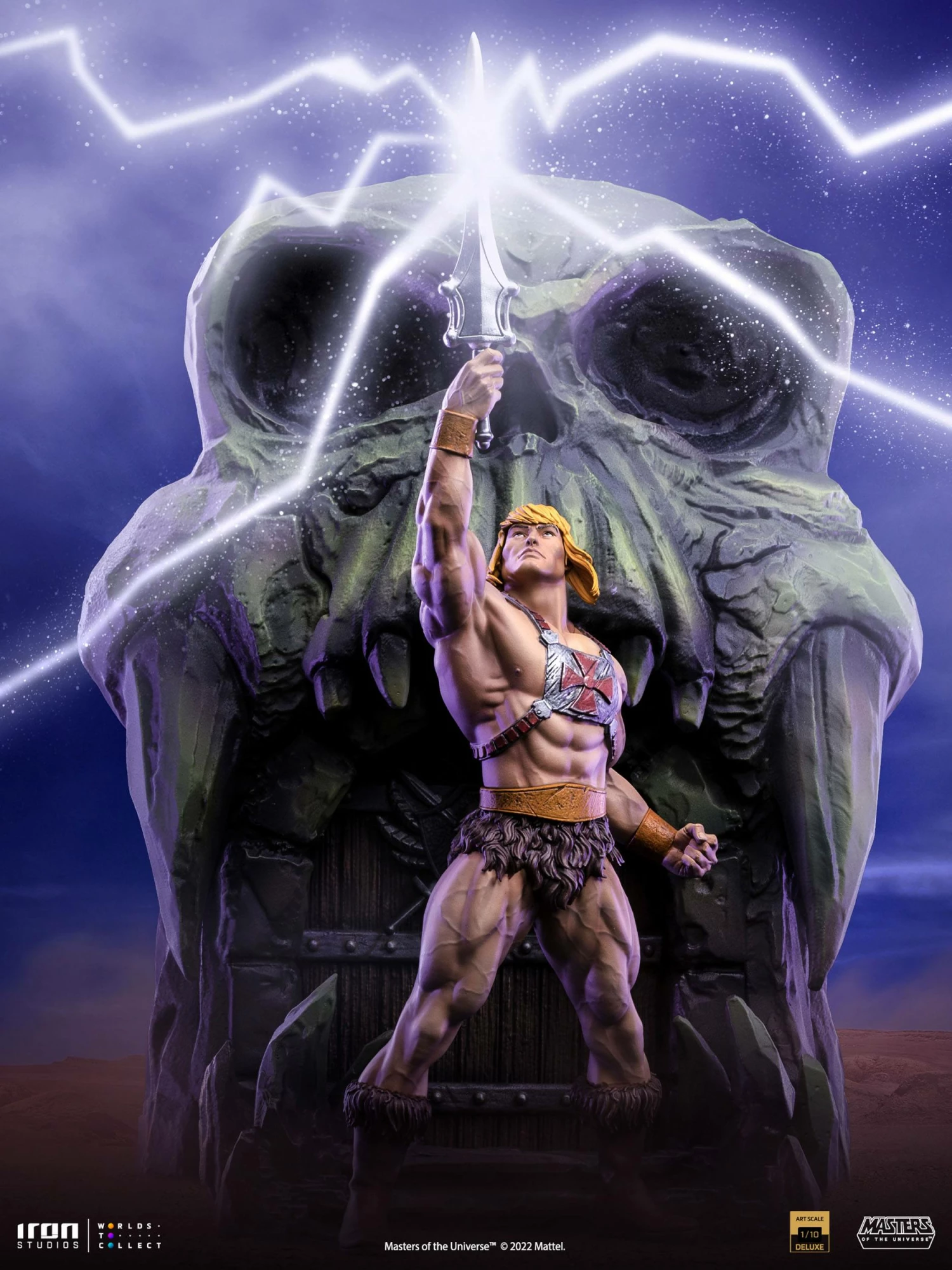 On the distant planet Eternia in the center of the universe, in front of a mystic secular castle with the entrance in the shape of a skull, a muscular warrior with tanned skin and long golden hair raises his magic Power Sword, proclaiming his mantra, calling down beams and rays of pure energy that transform him into the most powerful man in the universe. Uttering the words “By the power of Grayskull …” the young Prince Adam transforms and asserts “… I have the power!” while gaining the form of a giant barbarian and becoming the defender hero of the secrets of Castle Grayskull. One of the most awaited statues by fans and collectors since the announcement of the release of their MOTU line, Iron Studios proudly present “He-Man Deluxe – Masters of the Universe – Art Scale 1/10”, with the iconic protagonist hero from Masters of the Universe replicating his unmistakable transformation scene on a stylized pedestal of the gate from Grayskull.