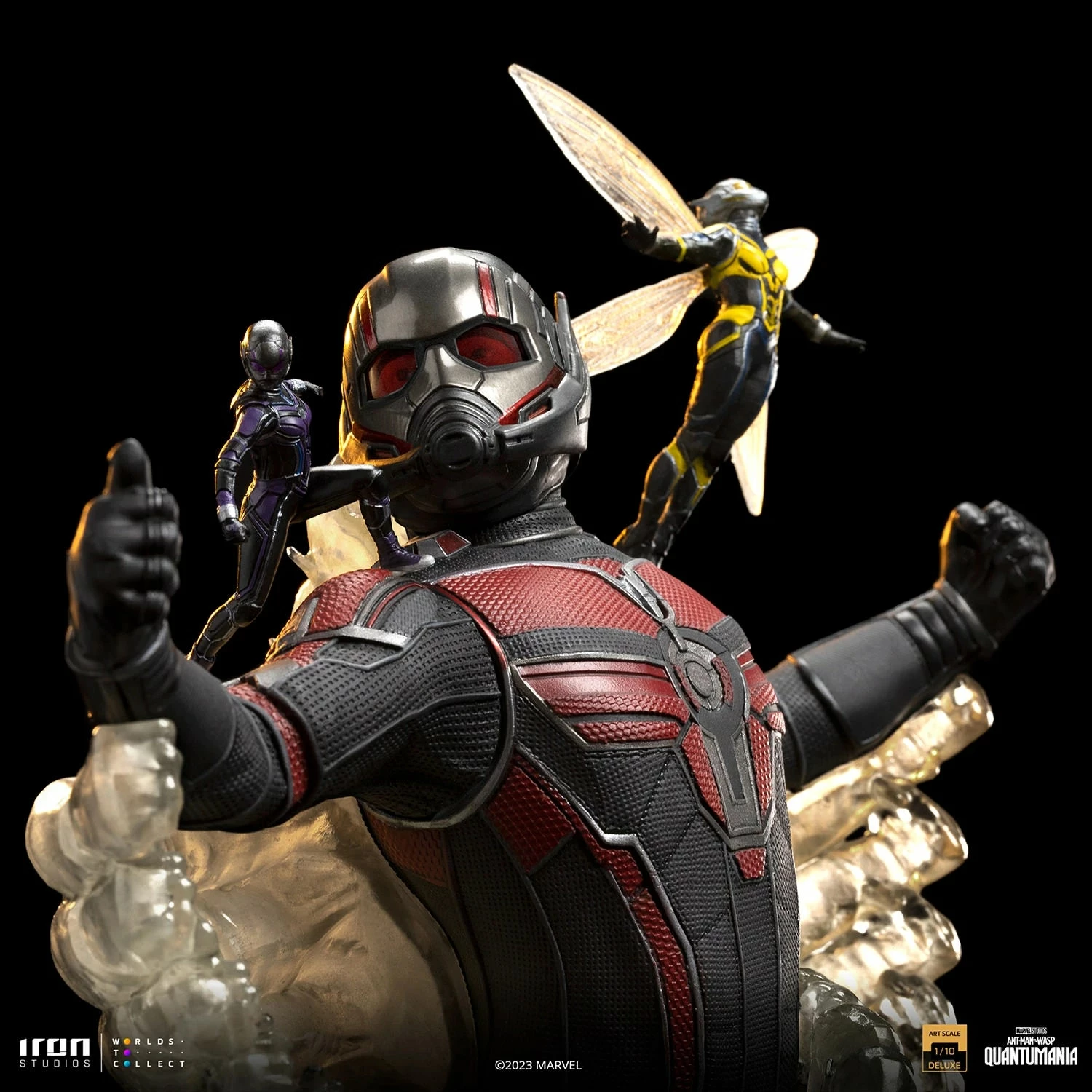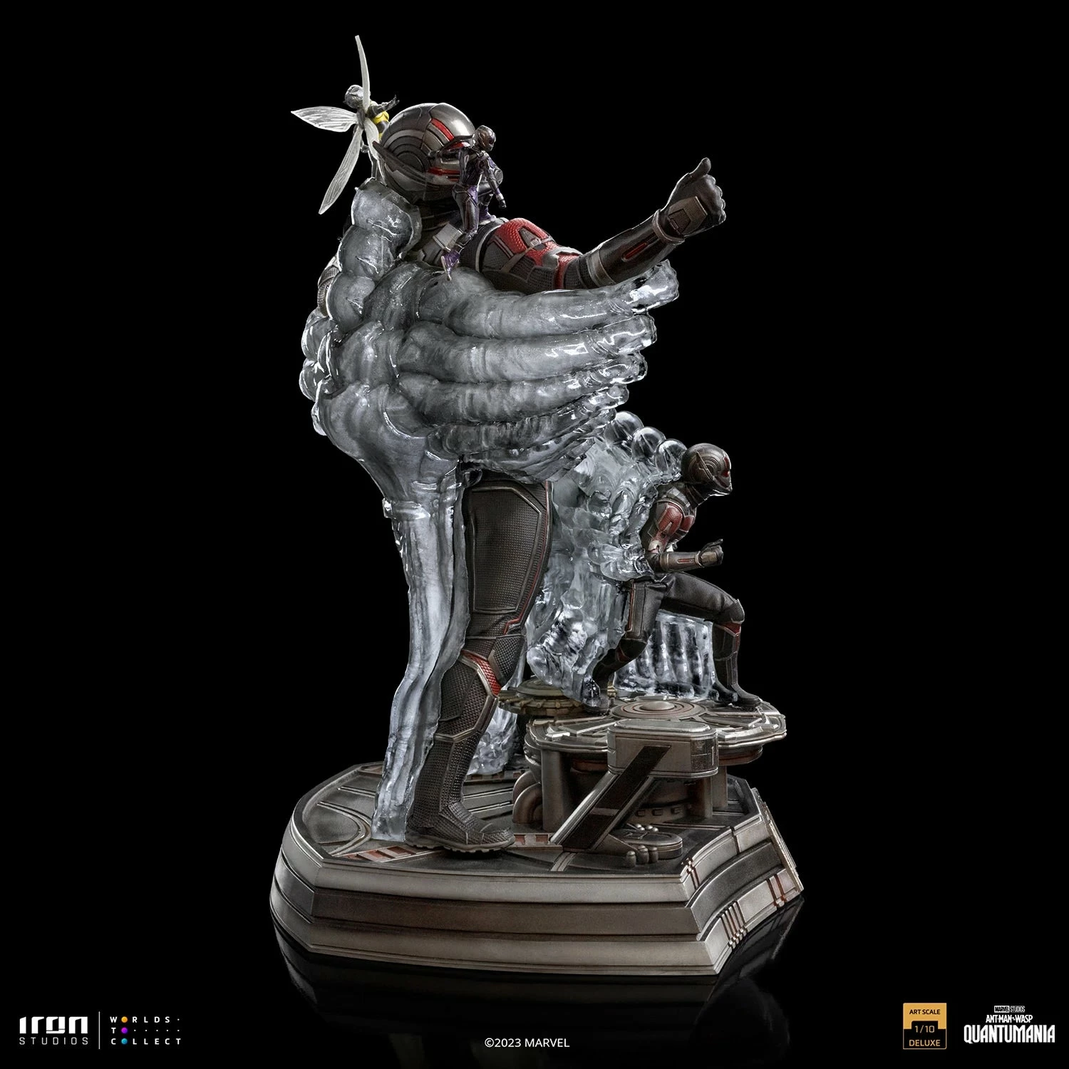 With subatomic particles enlarging and reducing his mass and density, the former convicted thief and reluctant hero once again wears the special costume that allows him to manipulate his size and strength and returns to the mysterious Quantum Realm, an extradimensional universe accessible through magic, through the unique Pym Particles, or through the inter-dimensional gateway called Quantum Tunnel. In his giant form, the avenger hero brings Cassie Lang on his right shoulder, his now-grown-up daughter with her own costume as the heroine Stature, and his beloved partner Hope van Dyne, the Wasp, clapping her wings and flying over his left shoulder. Over a detailed base with technological and futuristic elements that refer to Axia, a city established in the Quantum Realm, Iron Studios proudly present their statue ” Quantumania Ant-Man and the Wasp Deluxe – Quantumania – Art Scale 1/10″ based on the 31st movie in the MCU, where Scott Lang and his family face the threat of Kang, the Conqueror.