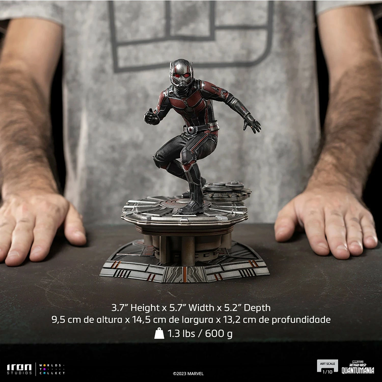 With subatomic particles enlarging and reducing his mass and density, the former convicted thief and reluctant hero once again wears the special costume that allows him to manipulate his size and strength and returns to the mysterious Quantum Realm, an extradimensional universe accessible through magic, through the unique Pym Particles, or through the inter-dimensional gateway called Quantum Tunnel. Iron Studios bring the statue “Quantumania Ant-Man – Quantumania – Art Scale 1/10”, with the miniature Avenger ready for action over a platform base inspired by the architecture of the futuristic city Axia from the Quantum Realm, based on the 31st movie in the MCU, where Scott Lang and his family face the threat of Kang, the Conqueror.