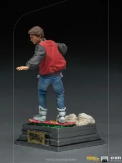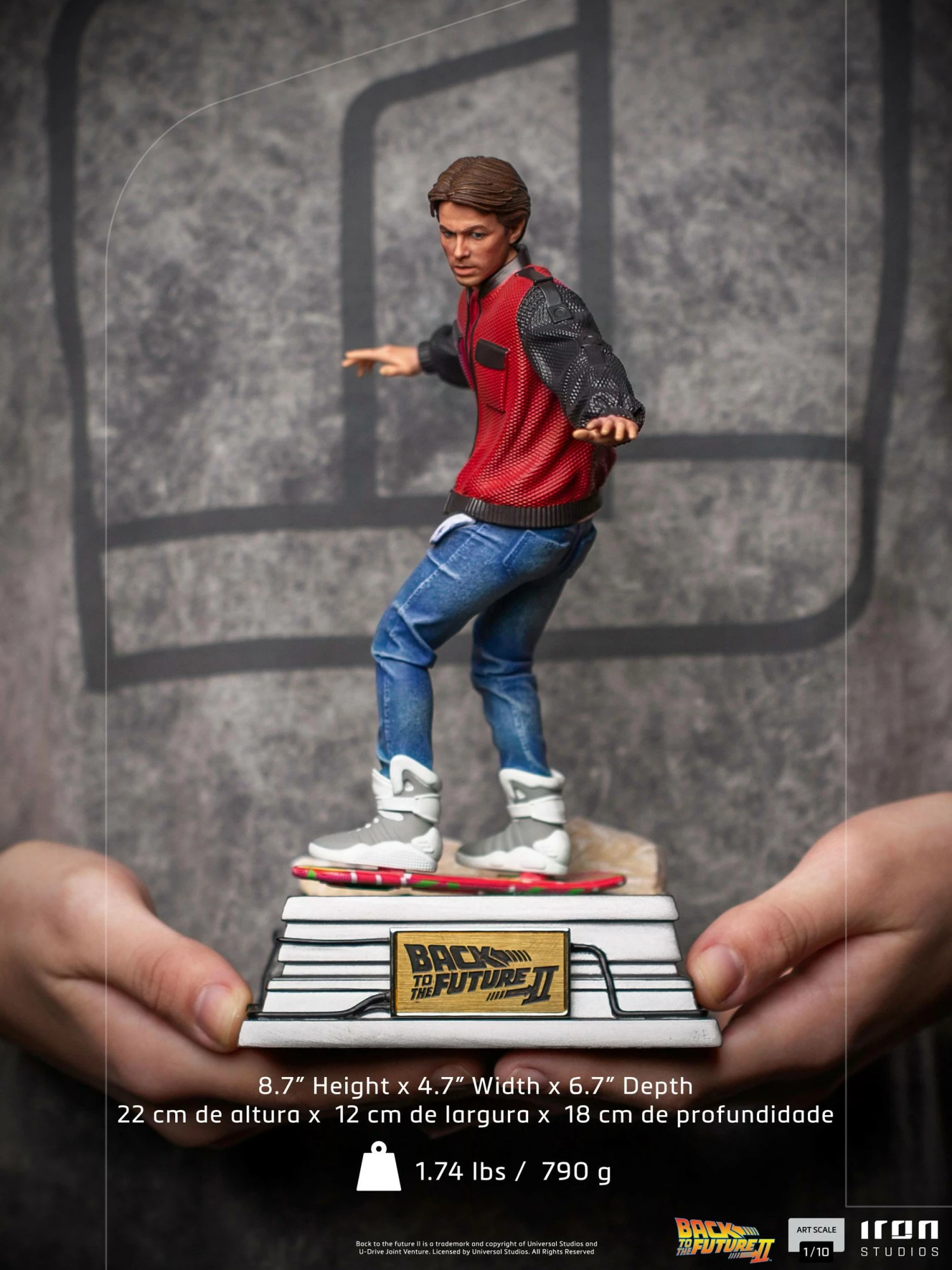 Marty tries to balance himself by floating over a small lake at Court Square in Hill Valley in the future, but the challenge becomes even greater when he discovers that the hoverboard loses power over the water. This iconic scene, derived from 1989’s Back to the Future Part II, is immortalized in an unprecedented collectible from Iron Studios, “Marty McFly on Hoverboard Art Scale 1/10 – Back to the Future Part II – Iron Studios”, that perfectly replicates the characteristics of the actor Michael J. Fox. McFly stands on a silver base stylized with details that resemble parts of the DeLorean DMC-12, the car that was turned into a time machine and created by his best friend, the scientist Dr. Emmett “Doc” Brown, who took the young hero on the journey into his future.