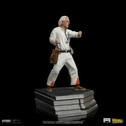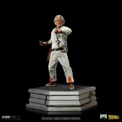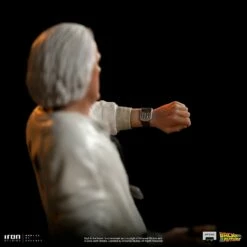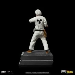 A crazy mix between the features of the British conductor Stokowski with the physicist Einstein, with a tool bag attached to his belt, the genius scientist dressing white coveralls with the radiation symbol on the back and details in orange, brings his stopwatch hanging from his neck connected to a portable printer in his waist, and checks with anxiousness and concerned eyes his digital wristwatch to coordinate with precision the test of his greatest creation. Inspired by his original appearance on the big screen, Iron Studios present the statue “Doc Brown – Back to the Future – Art Scale 1/10”, the co-protagonist of the movies in the “Back to the Future” franchise, produced based on the original references, portraying a fantastic similarity with actor Cristopher Lloyd and his features. Available both individually, in a base that can connect with the statue of his young friend Marty McFly (sold separately), and as part of the diorama set “DeLorean Full Set Deluxe – Back to the Future – Art Scale 1/10”.