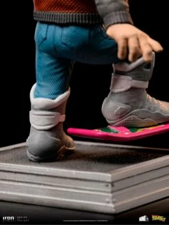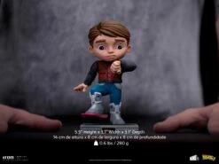 Recently arriving in the hypothetical year of 2015 with the legendary DeLorean car, the young adventurer looks worried at his watch, ready to get into the action with his Hoverboard, and wearing automated futuristic clothes, including an auto-adjusting and auto-drying jacket, and a pair of selflacing shoes, he runs against time to fulfill his mission to prevent his future son from being arrested. In their increasingly beloved, praised, and collected stylized Toy Art style, Iron studios present their statue “Marty Mcfly – Back to the Future Part II – MiniCo”, for the first time in this format by Iron Studios, over a pedestal with the movie’s logo in the front, inspired by the second part of the iconic movie trilogy.