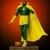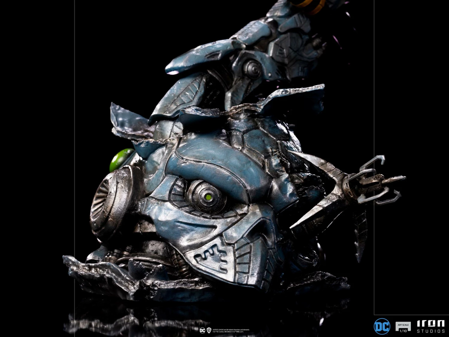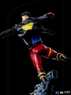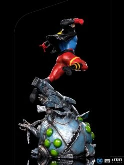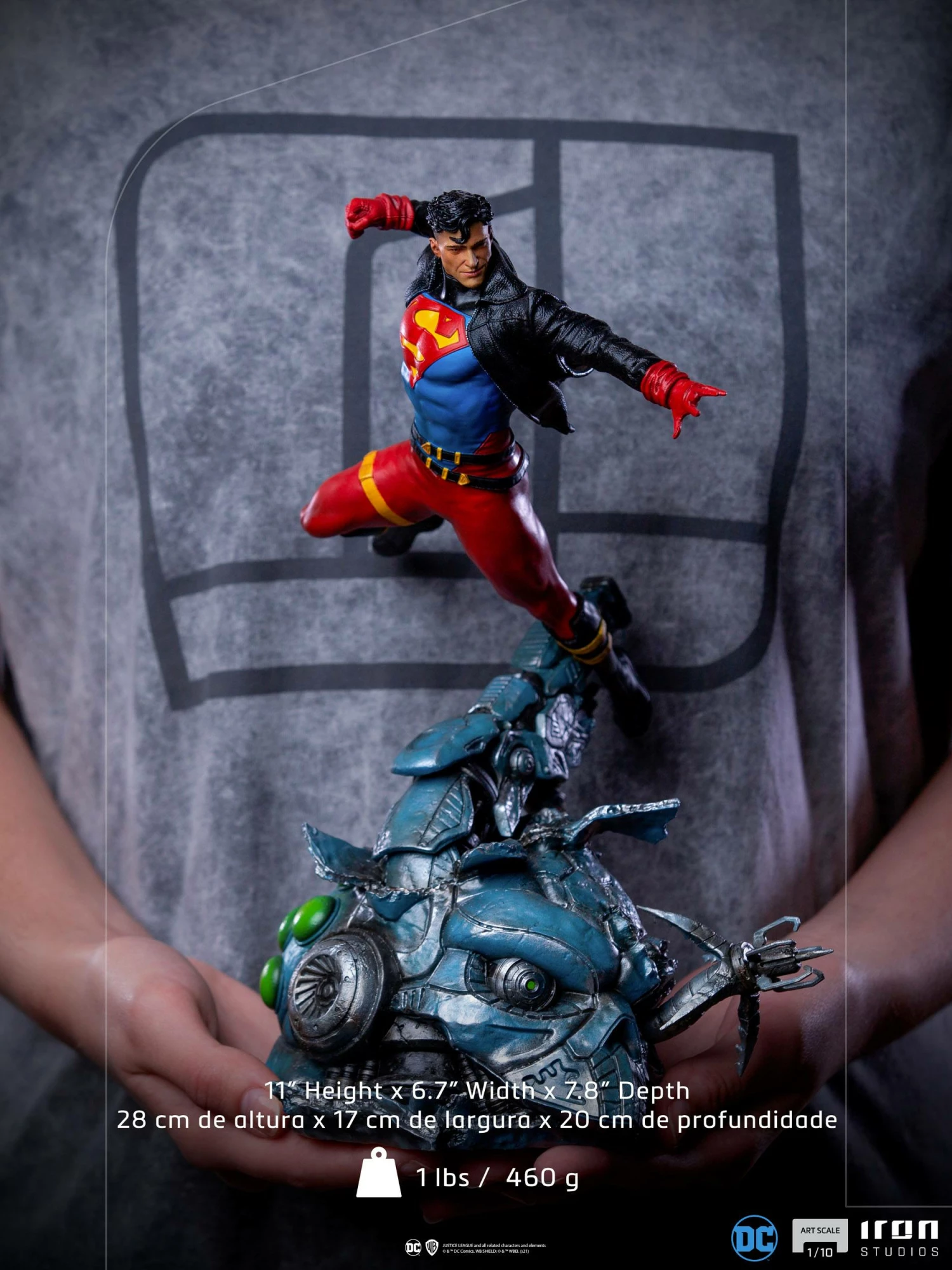 On a base in the form of twisted metal, from the skull remains of the Kryptonian robotic supervillain Brainiac, or one of his mechanical creations, a mighty young hero flies in his skin-tight blue and red uniform, with the unmistakable “S”-shaped symbol coat of arms on his chest, and a peculiar black leather jacket to express his rebelliousness and identity. Ready to deliver its mighty blows with its red gloved fists, Iron Studios presents the “Superboy Deluxe – DC Comics Series #7 – Art Scale 1/10” statue featuring the Steel Boy, allied with the Superman family and the Teen Titans!