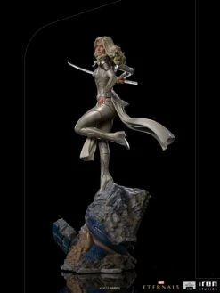 Dedicated in her role as the warrior of the Eternals, with the power of manifesting any portable gun she can think of, she wields a sword of pure cosmic energy, capable of cutting even the horn of a monstrous Deviant. Gifted with superhuman strength, speed, and endurance, and wearing her white celestial armour, her combat abilities combined with her acrobatic talents make her one of the most efficient among the Eternals in the fight against their enemies. Jumping over ancestral ruins, Iron Studios present the statue “Thena BDS – Eternals – Art Scale 1/10”, bringing the relentless and fierce combatant of the immortal heroes’ group.