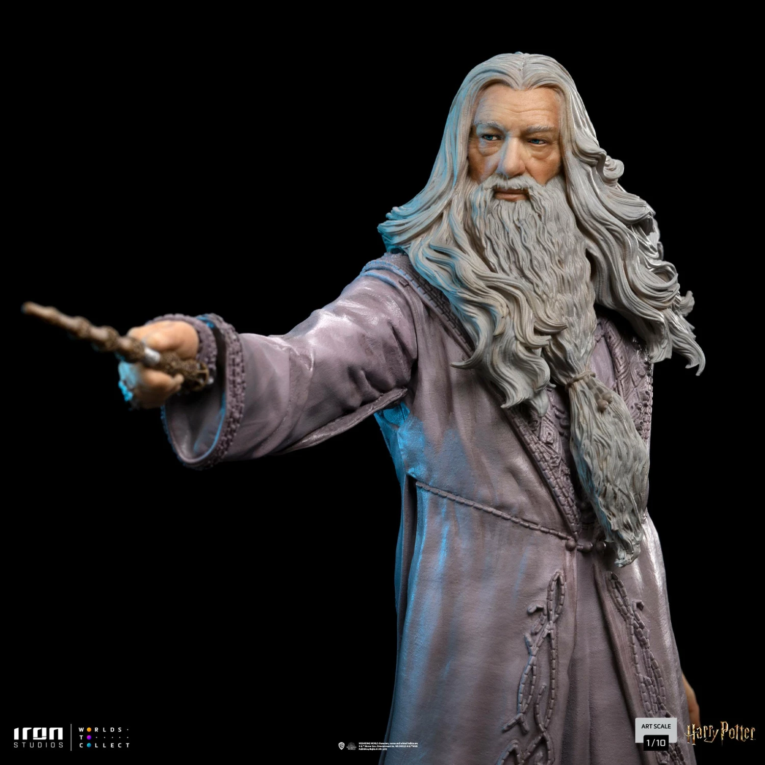 At the top of a tower, behind a door hidden by a gargoyle on the third floor of the west part of Hogwarts Castle, the wise, elder, and tall master with long hair and a long beard with its ends tied in gray color, wearing a gray tunic he points his extremely powerful Elder Wand of which he became owner and master, also known as “Wand of Destiny”. In his office, at the top of small stairs formed by stone steps built at the end of the Middle Age, the Headmaster of the School of Witchcraft and Wizardry Hogwarts majestically presents himself in his statue “Dumbledore – Harry Potter – Art Scale 1/10” by Iron Studios, fulfilling the desire of countless fans of the Harry Potter saga in the movies.