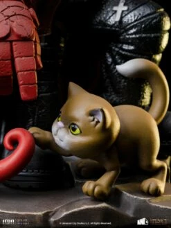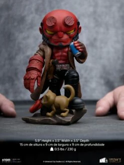 Next to one of his many small feline pets, the red giant with yellow eyes and black hair plays with his kitten using his long tail and his right hand made of stone, while quenching his thirst with a can of his favorite beverage. With the body covered by an overcoat and wearing tactical pants and boots, he brings the Samaritan on his waist, an extremely large weapon used for eliminating monsters, in a holster attached to a belt with a buckle bearing the B.P.R.D logo, an organization of which he is part of. One of the most beloved and charismatic modern heroes in the comics, movies, animations, and video games gets his first statue by Iron Studios in the stylized Toy Art version “Hellboy – Hellboy – MiniCo”, inspired by his original movie from 2004 written and directed by the iconic Guillermo del Toro.
