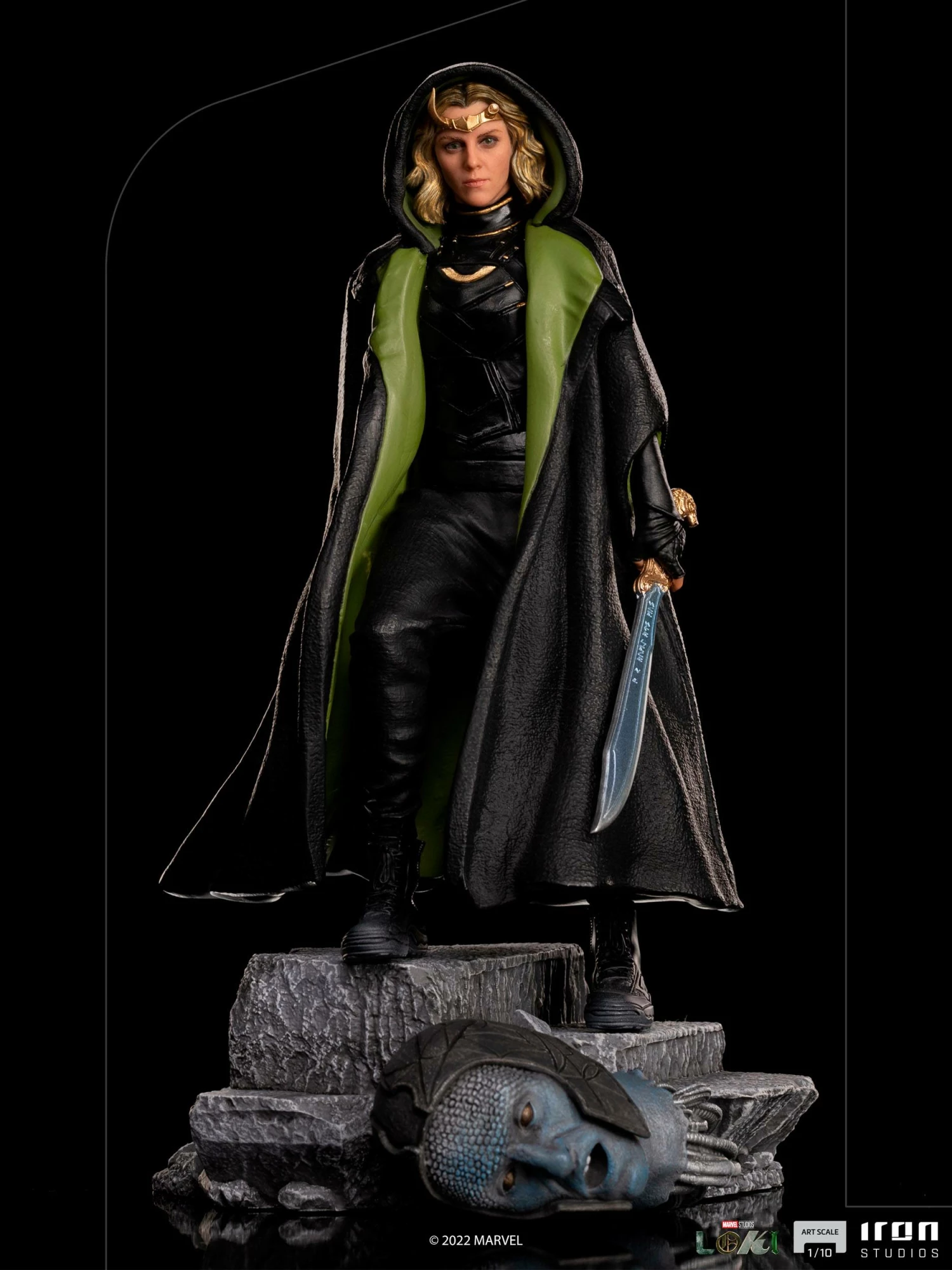 Inside the Time-Keeper’s chamber, spokespersons of the Time Variance Authority, ready to reach her objective, the Goddess of Mischief of an alternate Asgard, decapitated the head of one of the entities which turned out to be an android, concluding part of her revenge. Wielding her sword with Asgardian runes, wearing her green cloak and her golden tiara with horns (one of them broken), on a pedestal inspired by the scene described above with the robotic head at her feet, Iron Studios present the statue “Sylvie Loki Variant – Loki – Art Scale 1/10”, with the sorceress, Loki’s alternate version and ally, in the series of Marvel’s charismatic villain in the movies, produced for the Disney+ streaming service.