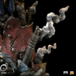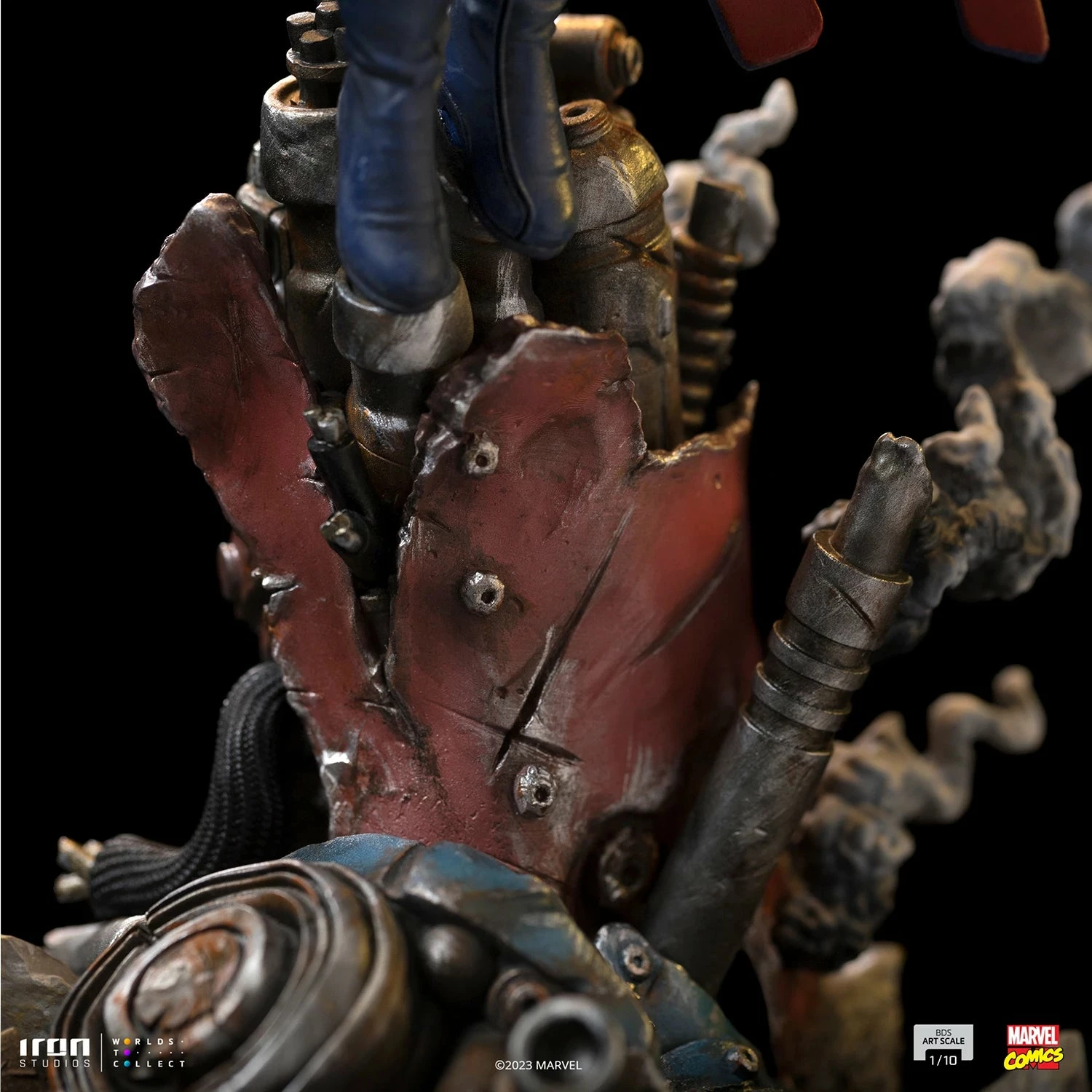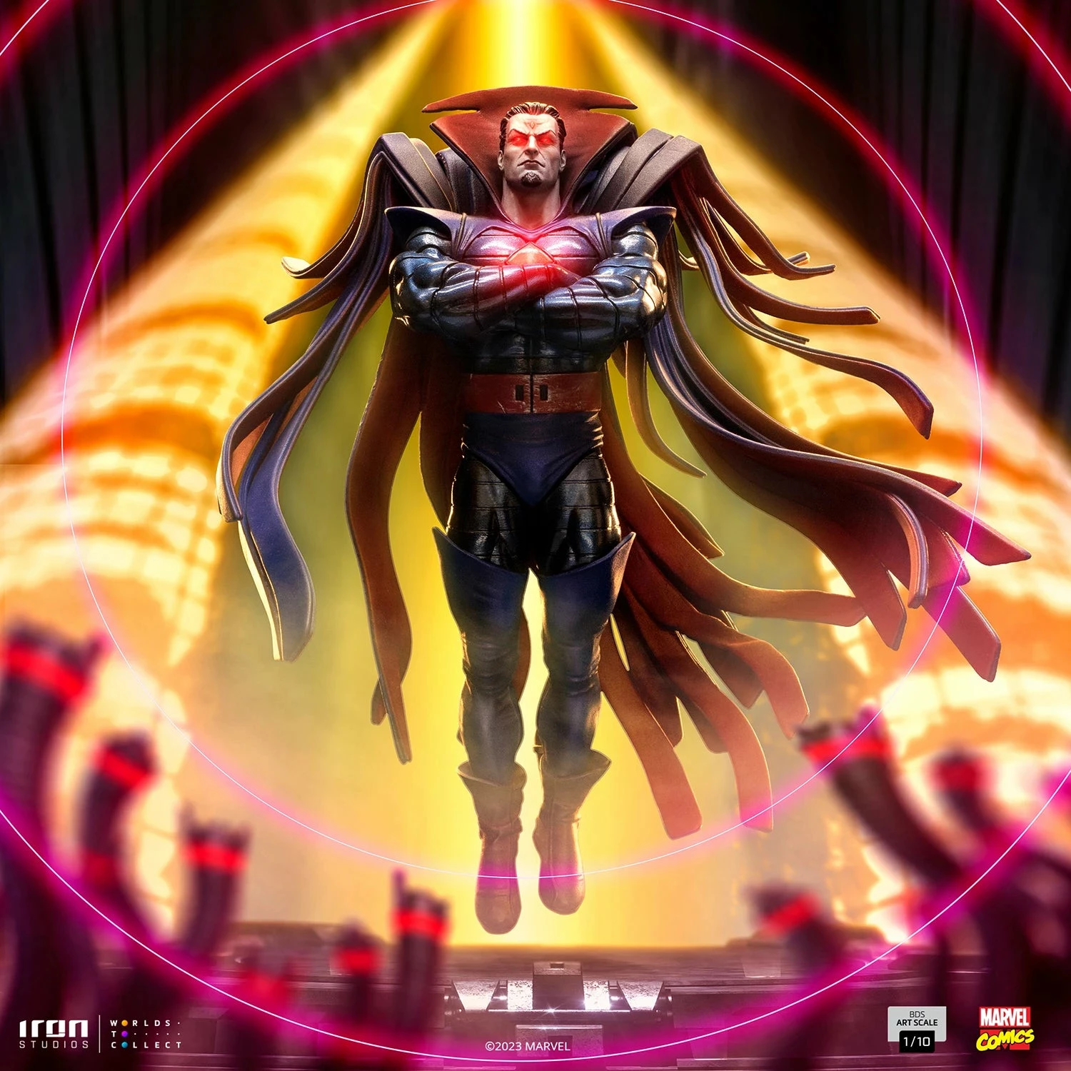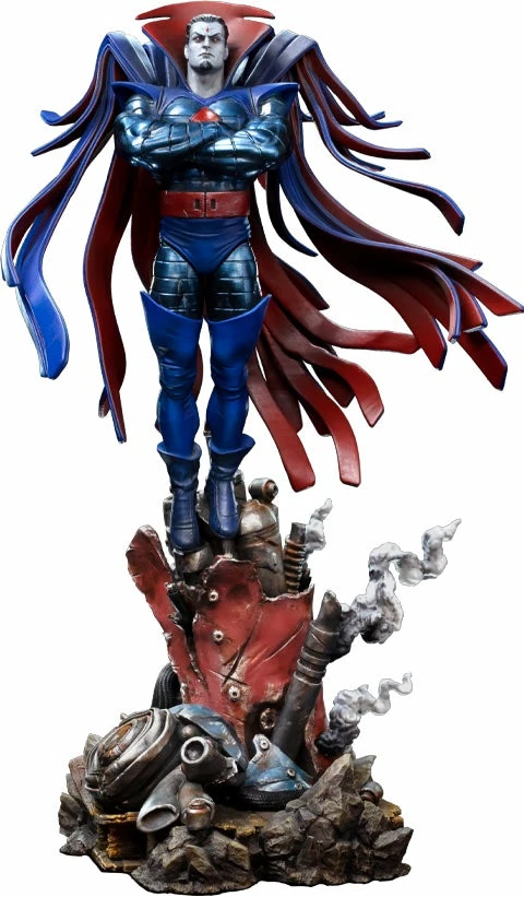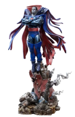 With a white skin as cold as marble, red eyes with no pupil, and sharp teeth, his appearance justifies his name. Genetically transformed, one of the brightest geneticists in the world enhanced his transformation for years, incorporating the genetic material of certain mutants into his DNA to get more abilities. Using his telekinetic powers that allow him to levitate, the unique villain floats over the mechanic debris of a Sentinel robot on fire, probably from its recent destruction. With the ability to control each molecule from his body, capable of absorbing the impacts and regenerating any damage, of altering and modifying his mass with a shape-shifting ability that allows him to assume the form of anyone, together with many other powers such as telepathy, concussive blasts, speed, endurance, strength, and superhuman senses, make him one of the most dangerous and lethal enemies of the X-Men. Using his classic look with an armor in shades of blue, silver, and red, with a cape of strips expanding from his back like wings, Iron Studios bring the statue “Mr. Sinister – X-Men – BDS Art Scale 1/10”, with the villain master of manipulation and strategic thinking, one of the most requested characters by fans and collectors for the collection of statues that compose the battle diorama of the X-Men facing the Sentinel robots controlled by Magneto and many other villains.