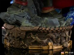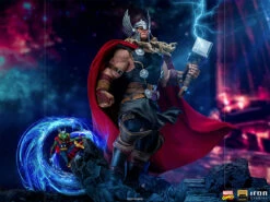 The base of the statue is full of details, such as stones and Nordic runes, the original symbol of the hammer Mjölnir, as in Viking culture depicted around the base. There is also an image of the giant snake that surrounds the world, Jormungand, and a warrior`s face, with a texture reminiscent of wood carvings. The statue, “Thor Unleashed Deluxe – Art Scale 1/10 – Marvel Comics – Iron Studios”, features the imposing Thunder God, leaning on the cracked rocks of a battlefield and wielding his mystic hammer with the inscriptions of the enchantments created by his father, Odin. Next to him is the blue energy effect that simulates an open dimensional portal, which reveals the peculiar small figure of Throg, the variant version of the hero in the form of a frog, holding his Frogjolnir hammer, a miniature version created from a sliver of Mjolnir. Meticulously detailed in the textures of his costume, in the sewings and adornments, the statue has a red cape made of fabric with inlaid wires for an even more realistic and dynamic shape.