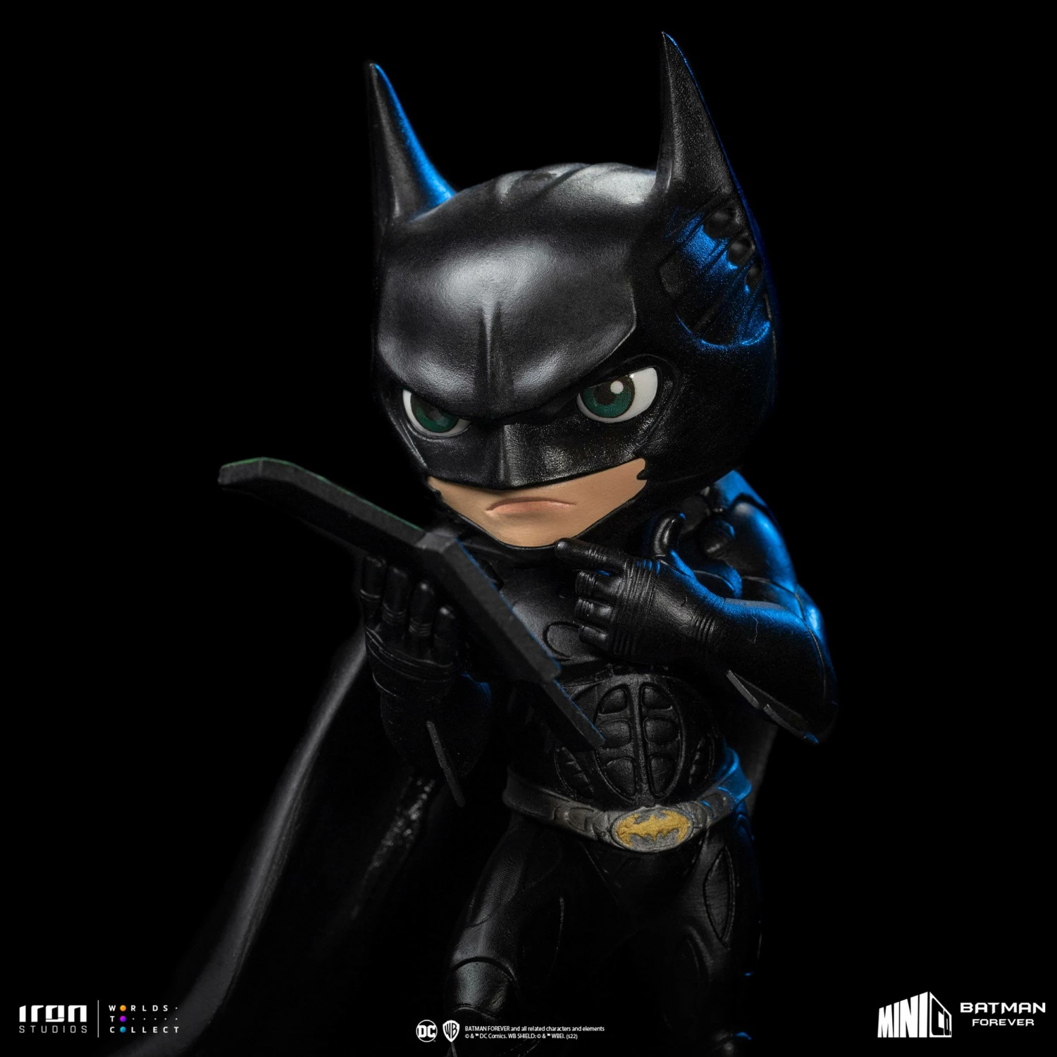 On a platform in his headquarters, the detective hero protector of Gotham City aims to decipher a riddle on the folding of a card sent to his alter ego, Bruce Wayne. With his cunning, wearing his new and stylish crime-fighting armor, soon he deduces the answer and gets ready to fight a new and mysterious villain. Inspired by the fun cinematographic production directed by Joel Schumacher, Iron Studios bring in their stylized Toy Art format the statue “Batman – Batman Forever – MiniCo”, a movie that brought Val Kilmer replacing Michael Keaton in the main role.