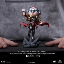 Wielding the magic hammer Mjølnir repaired, the mysterious figure of an Asgardian warrior, with the looks of a thunder goddess, appears on the battlefield to save the inhabitants of New Asgard village in Norway from the evil Gorr, the God Butcher. Using armor with a winged helmet that hides her true identity, the brave hero surprises her old love, the God of Thunder, by revealing her face and uniting her new powers against the villain. One of the protagonists in the new MCU movie, Iron Studios bring the statue “Mighty Thor Jane Foster – Thor: Love and Thunder – MiniCo”, presenting Thor’s old girlfriend as an Asgardian Viking warrior in the stylized Toy Art format from the MiniCo line.