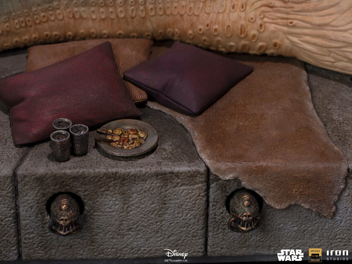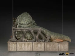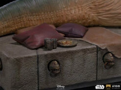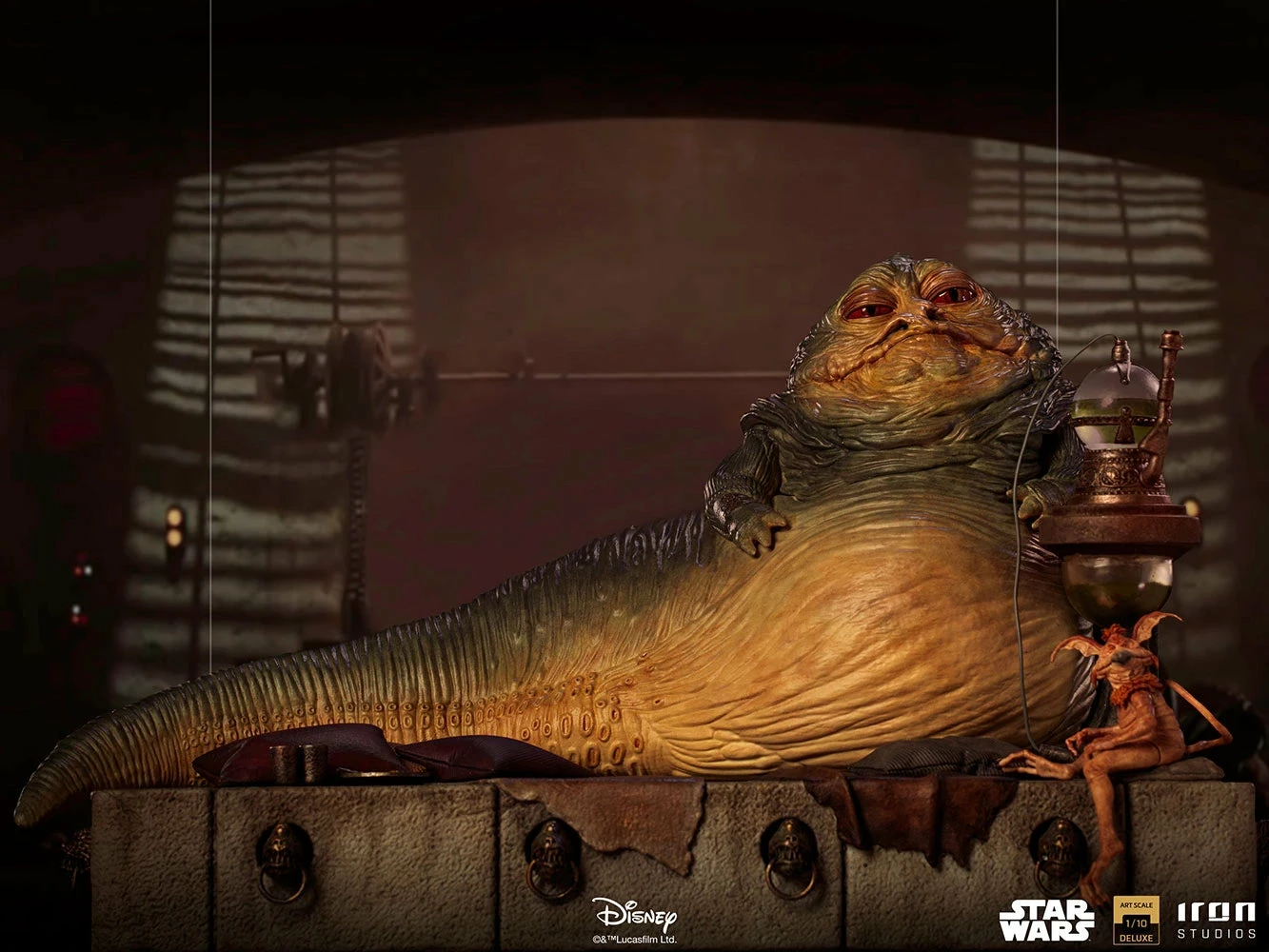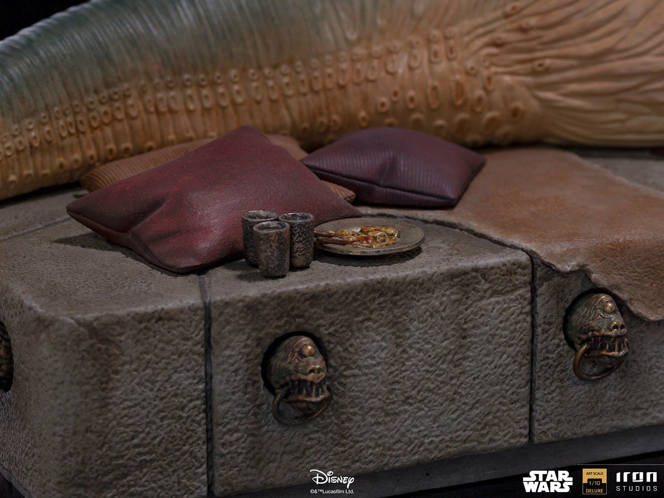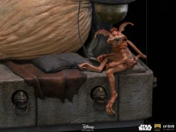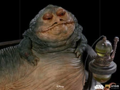 With his cruel eyes, the unscrupulous lord of crime judges his victims and watches his henchmen, resting his grotesque and greasy body on his throne, which is shaped like a concrete platform. His throne is surrounded by adornments in the form of bronze cyclopes, which have rings between their teeth to chain their slaves. The crime lord sits between fur cushions with a rustic hookah beside him, for his smoking pleasure, next to his mascot, and court jester, Salacious B. Crumb, a creature known as the Kowakian lizard monkey. In this way, Iron Studios presents its statue “Jabba The Hutt Deluxe Art Scale 1/10 – Star Wars – Iron Studios”, with the monstrous villain replicated as in his appearance in the sixth episode of the saga in theaters in “Star Wars: Return of the Jedi “from 1983.