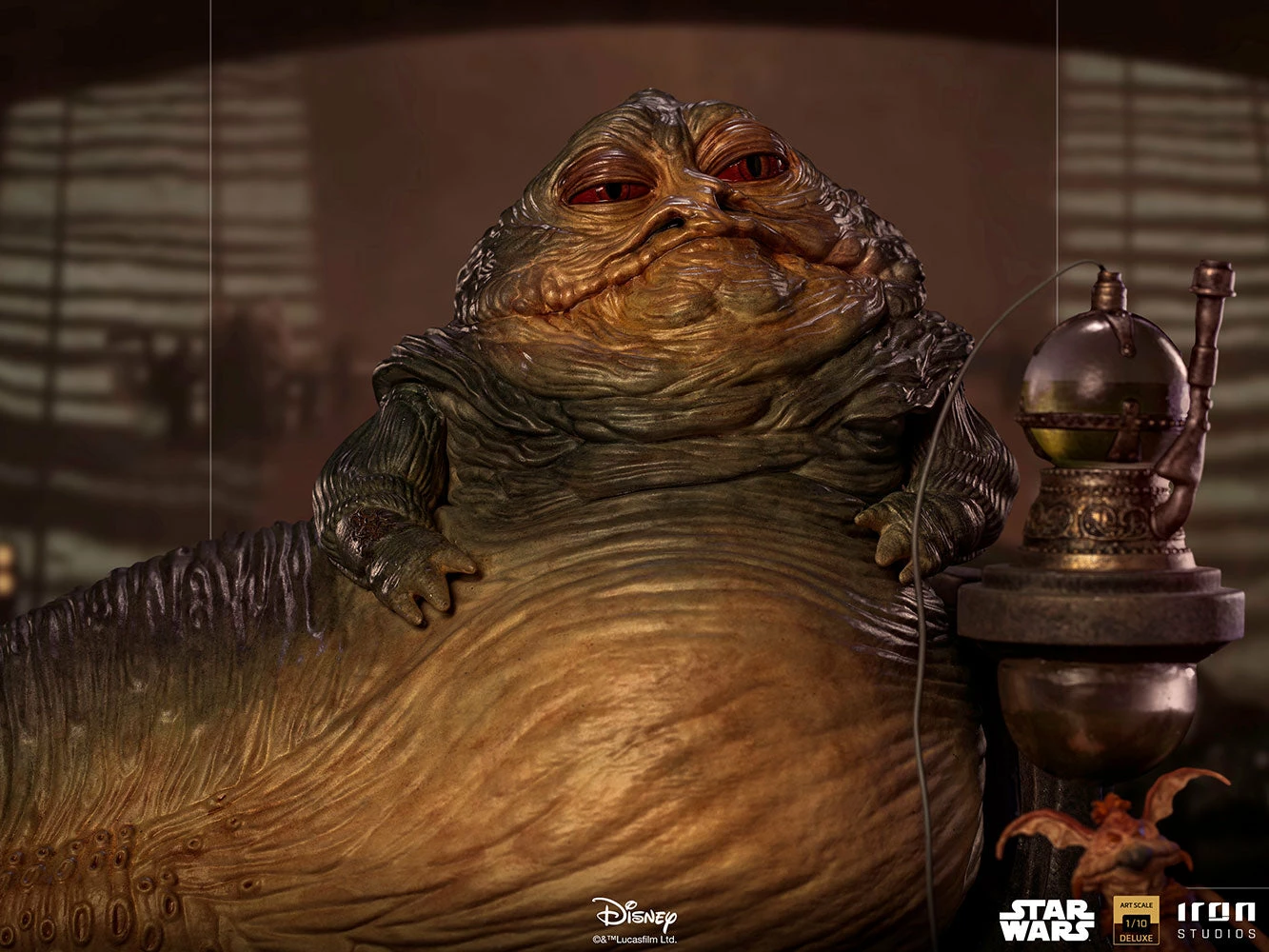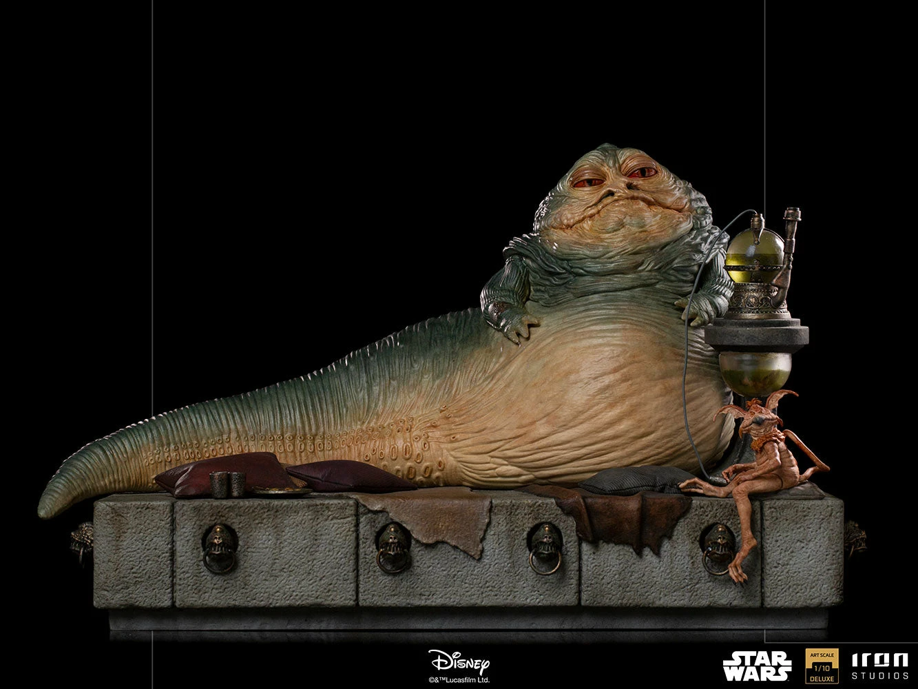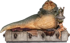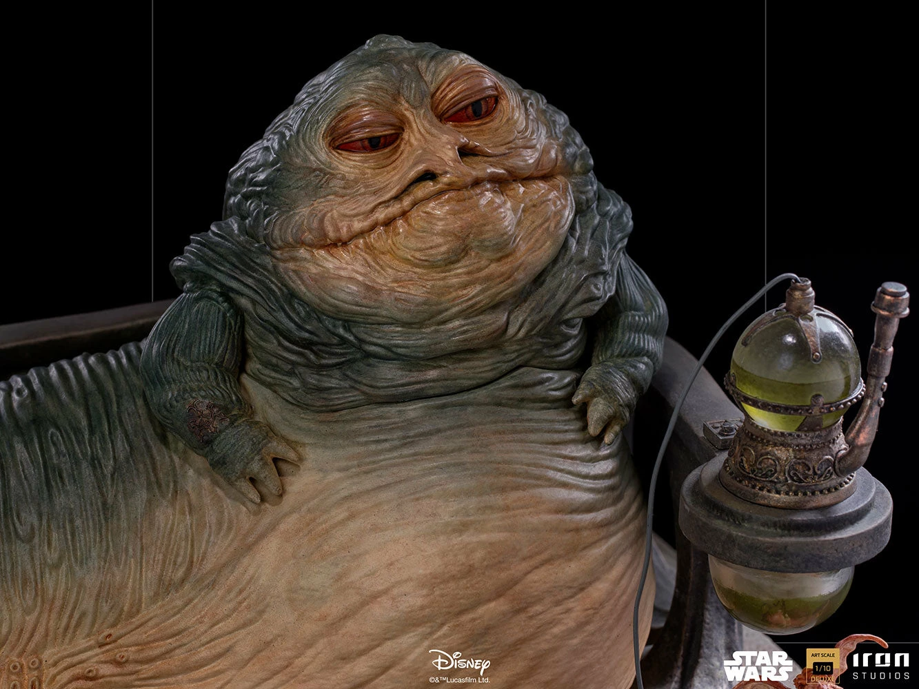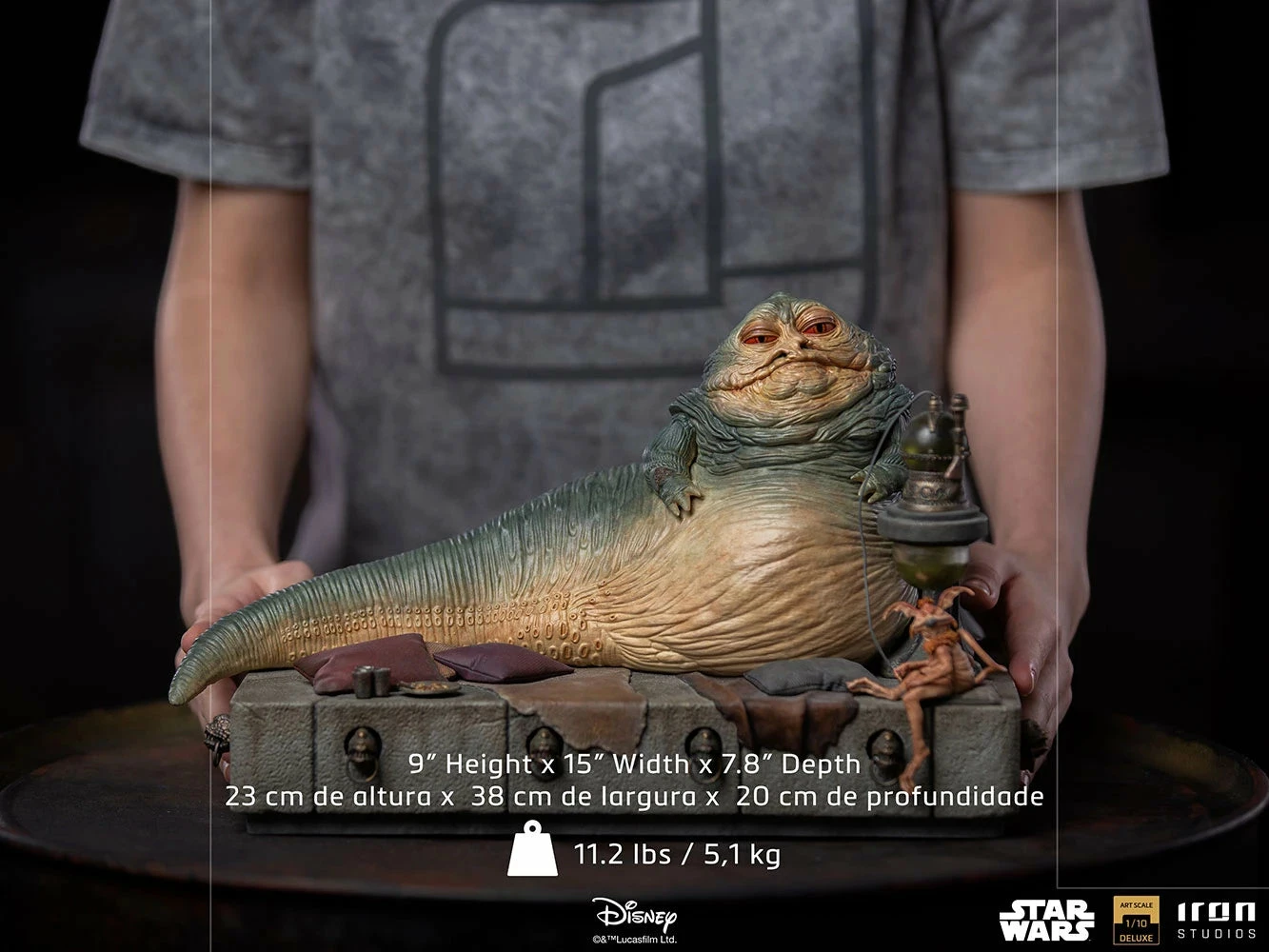 With his cruel eyes, the unscrupulous lord of crime judges his victims and watches his henchmen, resting his grotesque and greasy body on his throne, which is shaped like a concrete platform. His throne is surrounded by adornments in the form of bronze cyclopes, which have rings between their teeth to chain their slaves. The crime lord sits between fur cushions with a rustic hookah beside him, for his smoking pleasure, next to his mascot, and court jester, Salacious B. Crumb, a creature known as the Kowakian lizard monkey. In this way, Iron Studios presents its statue “Jabba The Hutt Deluxe Art Scale 1/10 – Star Wars – Iron Studios”, with the monstrous villain replicated as in his appearance in the sixth episode of the saga in theaters in “Star Wars: Return of the Jedi “from 1983.
