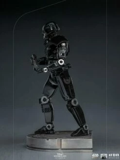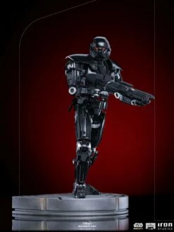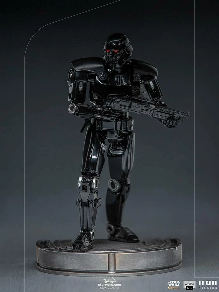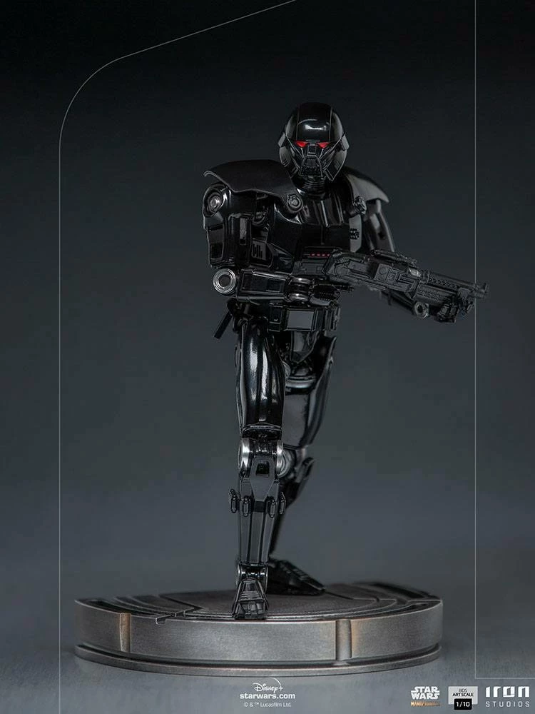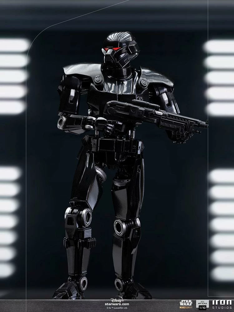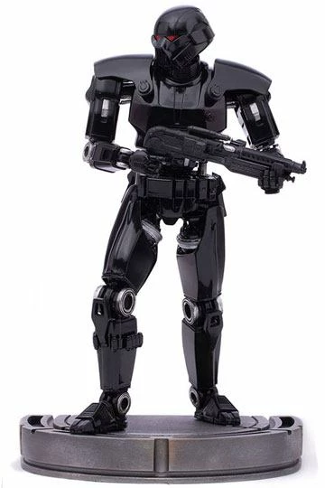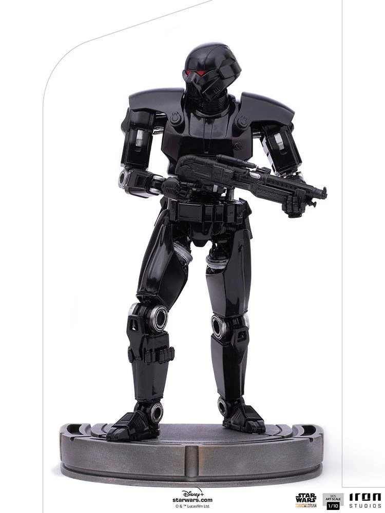 A figure covered in shining black armor is aboard Imperial Officer Moff Gideon’s space cruiser, directing his red photoreceptor eyes towards his objective, wielding a large blaster rifle and ready to fire with precision at any target. Iron Studios thus presents its statue of the fearsome “Dark Trooper BDS Art Scale 1:10 – The Mandalorian – Iron Studios“, one of the most efficient and powerful Imperial combat droids. Just as seen in the second season of The Mandalorian series, a spin-off from Star Wars on the Disney+ streaming channel.