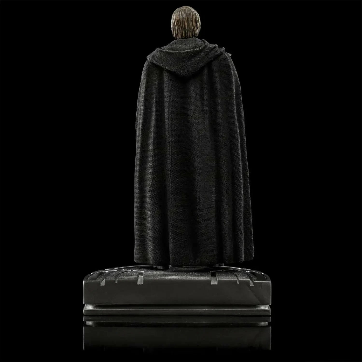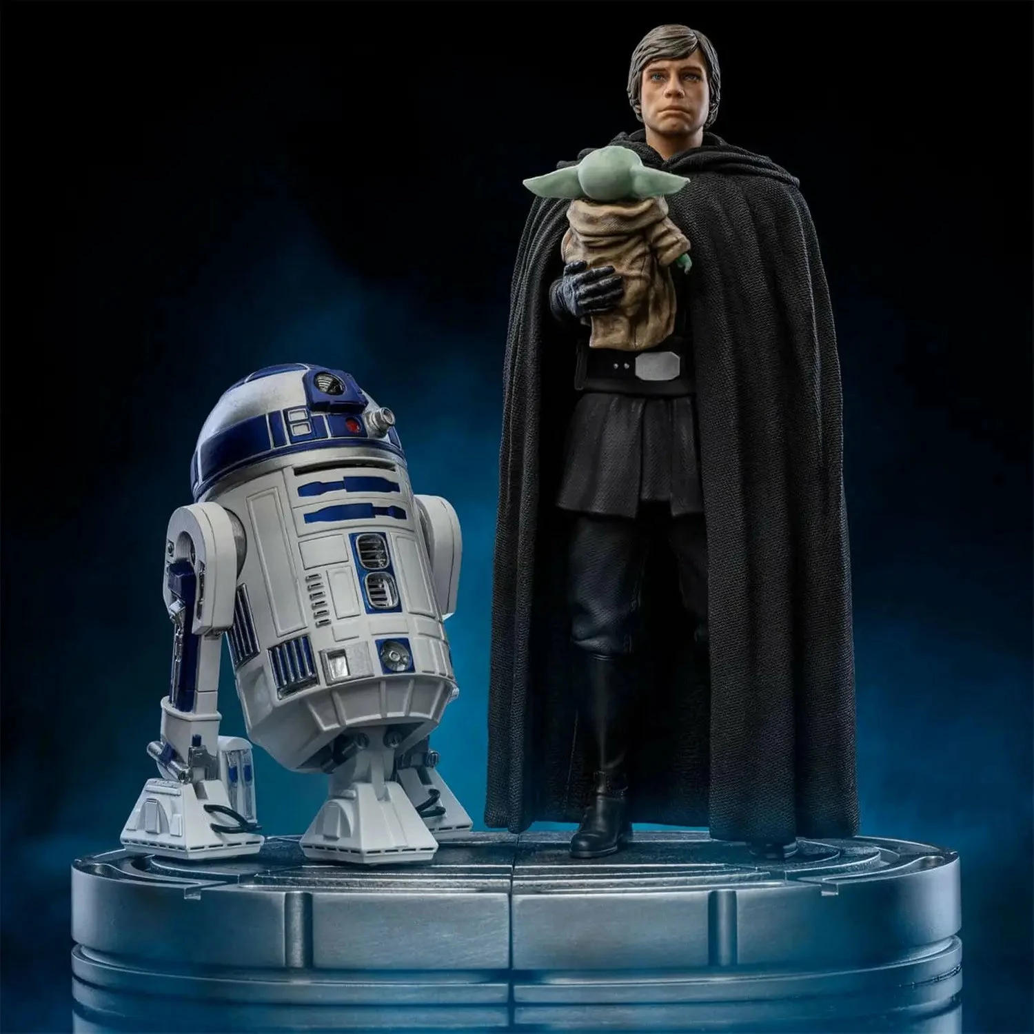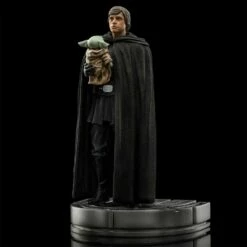 Bringing on his right arm a Force-sensitive child called Grogu, a native of the same species as his old master Yoda, and just like him, has a strong connection to the power of the Force, the Jedi Master, wearing a cloak and black costume, contemplates with tranquility and wisdom, after answering to the small being call, that now must follow the apprentice path with his new guardian and master. One of the most exciting scenes of the last episode of the 2nd Season of “The Mandalorian” series in the Disney+ streaming service, is masterfully presented in the statue “Luke Skywalker and Grogu – The Mandalorian – Art Scale 1/10” by Iron Studios.