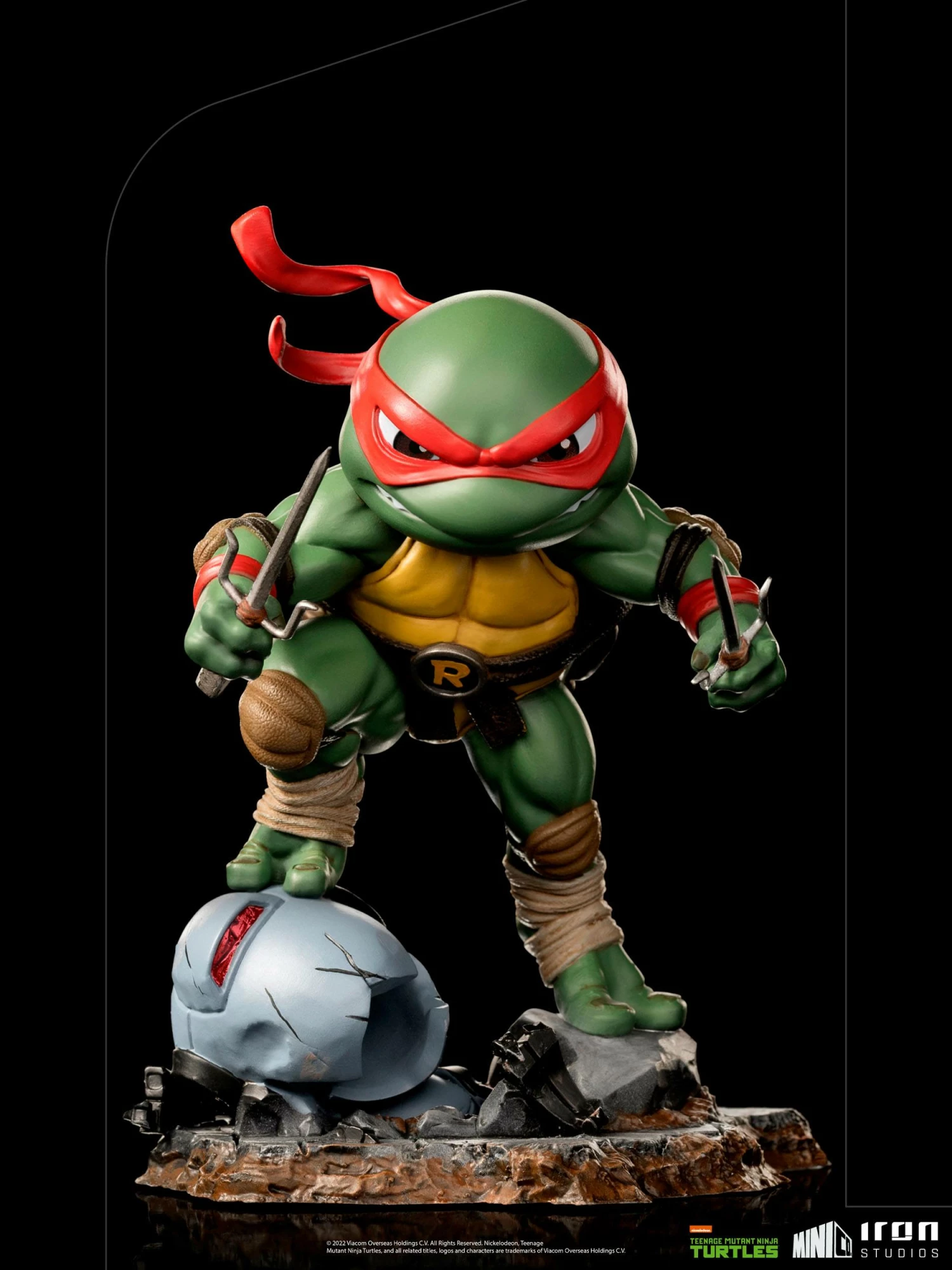 Always cranky, over a pedestal where he’s crushing a destroyed robot enemy, and holding his favorite weapons, a pair of Sai daggers, Iron Studios present the statue “Raphael – TMNT – MiniCo”, with the group’s rebel. Also called Raph by his brothers, he plays the role of the tough guy. Explosive, moody, and almost always grumpy, he is distinguished by his red mask and has the name inspired by the Italian painter from the 16th Century Raffaello Sanzio da Urbino, he’s also the second eldest son among his brothers.