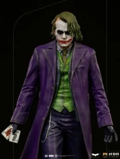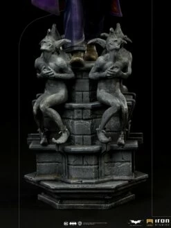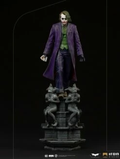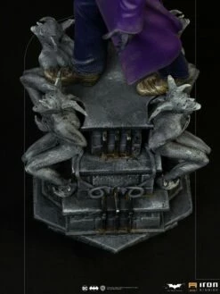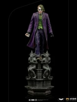 On top of a concrete totem pole, decorated with sculptures of medieval buffoons around him, which are symbols of the playing card that inspired his name, Gotham’s most fearsome villain poses on that base wearing his formal purple outfit and bringing in one of his hands his presentation card in the form of playing cards that say his name. Iron Studios proudly brings one of its most requested figures by fans and collectors of the chaotic villainous clown, “The Joker Statue – The Dark Knight – Art Scale 1:10 – Iron Studios”, in one of its most striking and emblematic representations.