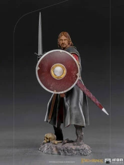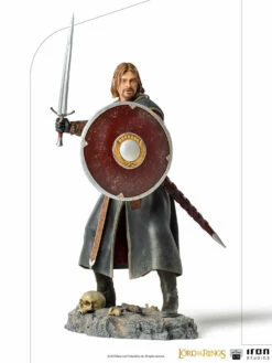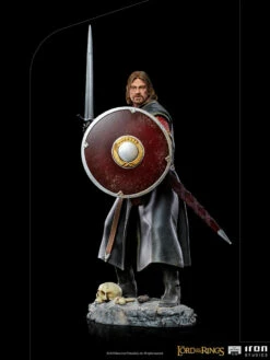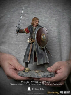 Faithful to the smallest details of the costume, characteristics, and physiognomy of actor Sean Bean, Iron Studios presents its statue of the warrior prince “Boromir – BDS – Lord of the Rings – Art Scale 1/10 – Iron Studios”, where the brave hero holds his circular shield firmly against his chest, while he wields his broad sword with his right hand, firm and focused for combat, carrying the Horn of Gondor, the symbol of his people and heritage of a line of Kings. This statue comes with a base representing the petrified ground of Minas Moria, with the remains of bones and weapons of Dwarf warriors, who are lying at his feet.