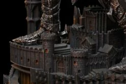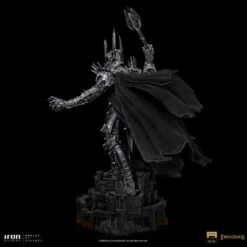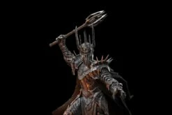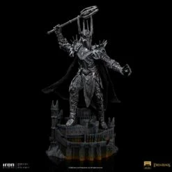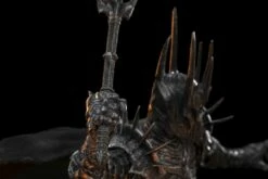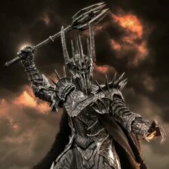 Wielding a giant iron war mace with six blades on top of his head, capable of killing dozens of men with only one strike, the fearsome Dark Lord reveals himself as if he was in the battleground. Wearing darkened steel armor similar to his old master Morgoth, worn to bind his spirit to his body, with his back covered by a rustic black cape and his face hidden by a sinister helmet with a crown of blades over his head. His imposing figure stands out on a diorama pedestal that replicates in detail his stronghold called Barad-dûr in Mordor, Middle-earth, his base of operations during the 2nd Age and the end of the 3rd Age. An entity whose mere presence causes fear in the heart of the bravest, Iron Studios bring the statue “Sauron Deluxe – The Lord of the Rings – Art Scale 1/10” with the main and most feared antagonist in the saga created by J.R.R. Tolkien, such as seen in the movie trilogy by director Peter Jackson.
