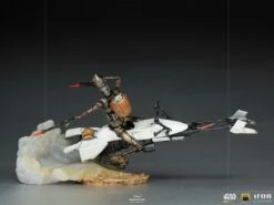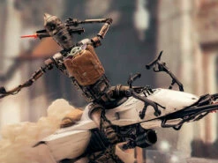 Like a fearless gunslinger from the wild west, riding through the city and eliminating evildoers, IG-11, mounted on a Speeder Bike, invades Nevarro`s city, thus raising a cloud of smoke and dust as he passes. He fires his blaster rifles, eliminating Imperial Stormtrooper soldiers that come his way, while protecting the little Grogu, who is attached to his chest, inside a bag like a canguru. The innocent Baby Yoda is even enjoying the situation. Thus, Iron Studios presents another emblematic moment of The Mandalorian series in the statue “IG-11 & The Child BDS Art Scale 1/10 – The Mandalorian – Iron Studios”.