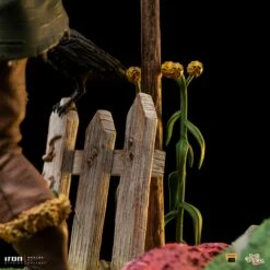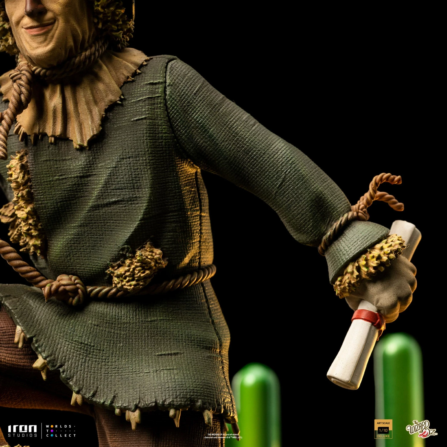 In a cornfield along the yellow brick road, the pretty girl from Kansas, Dorothy, arrives at a big intersection and, confused about which way she should follow, she finds a curious talking figure nearby to scare away the crows. Unhappy to fulfill his purpose of scaring the birds away, his biggest discontent was not having a brain. The girl tells him about her search for the Wizard that could help her get back home, and the stuffed figure joins her journey with the hope that the wizard can give him the so dreamed brain. With a finger on his head and bringing the diploma that proves his intelligence in one of his hands, Iron Studios bring the statue “Scarecrow Deluxe – The Wizard of Oz – Art Scale 1/10”, on a pedestal filled with details from the beautiful land of Oz, with the Emerald City in the background, the yellow brick road, and the Scarecrow played by Ray Bolger next to the cornfield post and fence with one of the crows he tries to scare in vain.